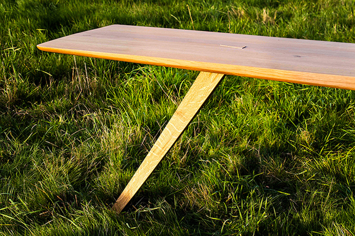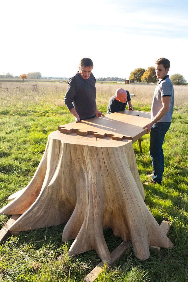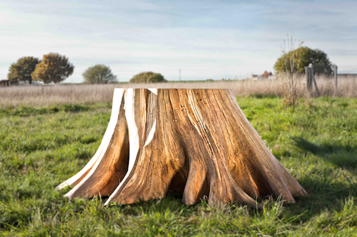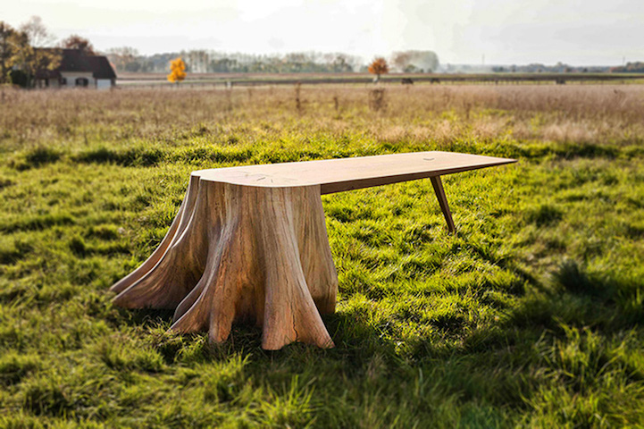 French designer Thomas de Lussac highlights the beauty of a simple tree stump with his stunning furniture project. Called the Racine Carr table (translated, this means Square Root), it incorporates powerful, raw roots into its sleek form. The flattened table top leans against the halved stump as the other end is propped up by a considerably smaller, polished leg. Similar to Fernando Mastrangelo's Drift Bench, Lussac's work blurs the line between furniture and sculpture.