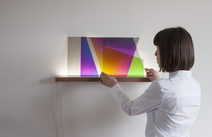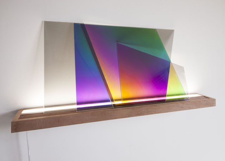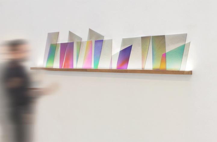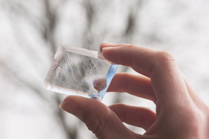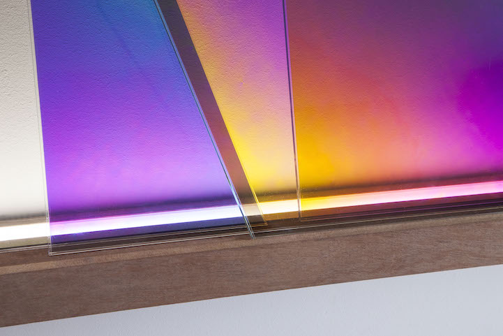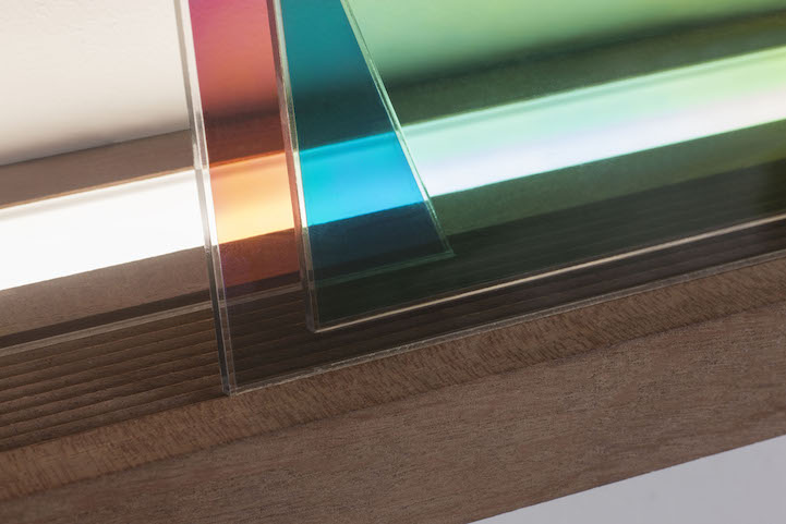 Crystal prisms are dazzling spectacles that refract light, slowing it down into different wavelengths that produce a variety of rainbow hues. With this phenomenon in mind, designers Thomas Vailly and Laura Lynn Jansen have created 101.86, a project that artificially reproduces the natural properties of a crystal found in the highlands of Iceland. The qualities of the stone have been translated into sheets of clear, treated glass. When they're layered over one another, the refracted light allows new and brilliant colors to emerge. The glass also has a kaleidoscopic effect–as its rotated, the hues instantly change.