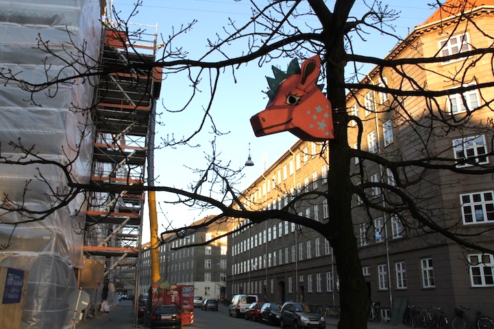 Hanging everywhere–in trees, on poles, at airports, on lampposts, on rooftops, etc.–the happy shelters provided a new resting place for birds across Denmark. Dambo points out, “Birds are actually great at recycling and we need to appreciate this. They eat old food, fruits, berries, and nuts lying about. In that way, they help to clean and distribute seeds around our cities, so new plants can grow.” Once the birdhouses were completed and installed, Dambo found himself with 1,000 triangles of leftover wood. So he gave the triangles eyes and beaks to mimic small birds, he affixed magnets, and he hung them on the streets as an advertisement for the project.