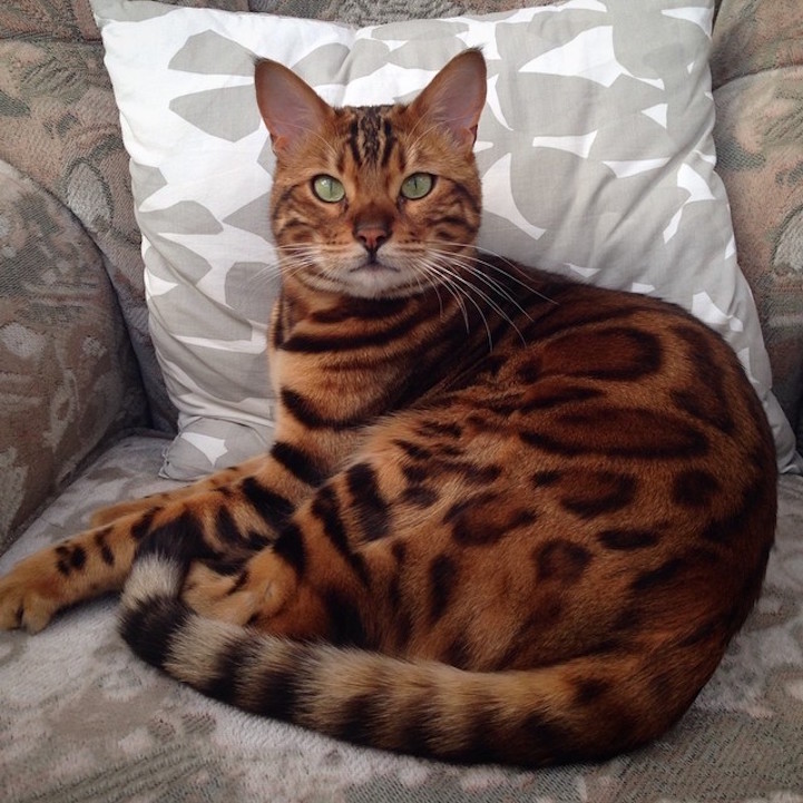 Having the same name as Thor, the hammer-wielding Norse god, is a lot to live up to, but a Bengal cat with an identical moniker does it justice. The four-legged Thor has a commanding presence with soulful green eyes and a majestic coat that looks too perfect to be real. But, Thor’s coloring is all natural—Bengals are known for their jungle-cat appearance, and Thor has a series of wild markings that include leopard spots and tiger stripes.