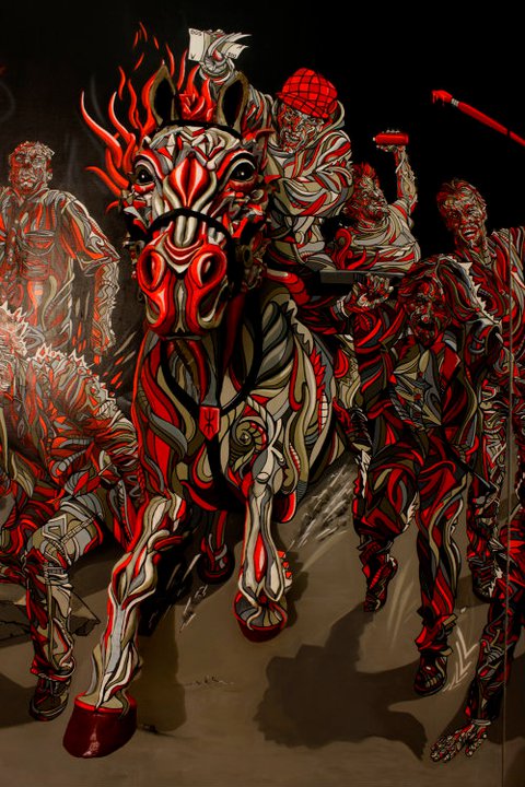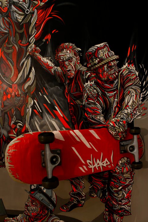 French artist Shaka does three dimensional art right! His use of bright color really makes his paintings pop. According to Juxtapoz, Shaka recently exhibited his amazing works at Galerie 208 in Paris.