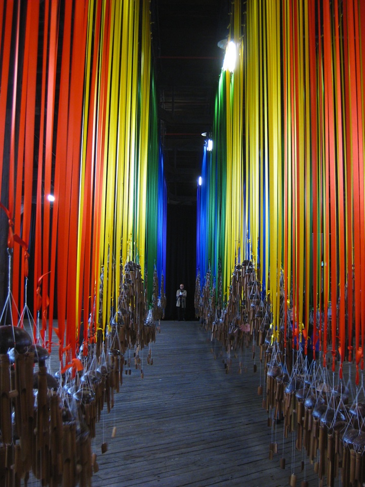 Currently showing at the 18th Biennale of Sydney is a gorgeous installation consisting of hundreds of bamboo wind chimes hanging from rows of colored ribbons. Called Knock On The Sky Listen To The Sound, it's by artist Tiffany Singh and it's on view in a cavernous hall of Pier 2/3 at nearby Walsh Bay.