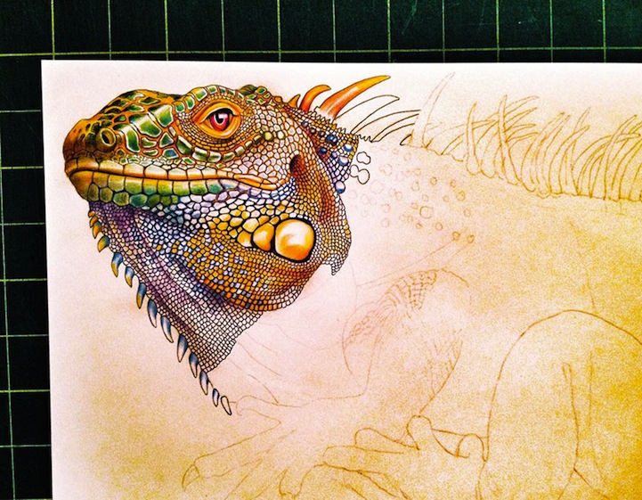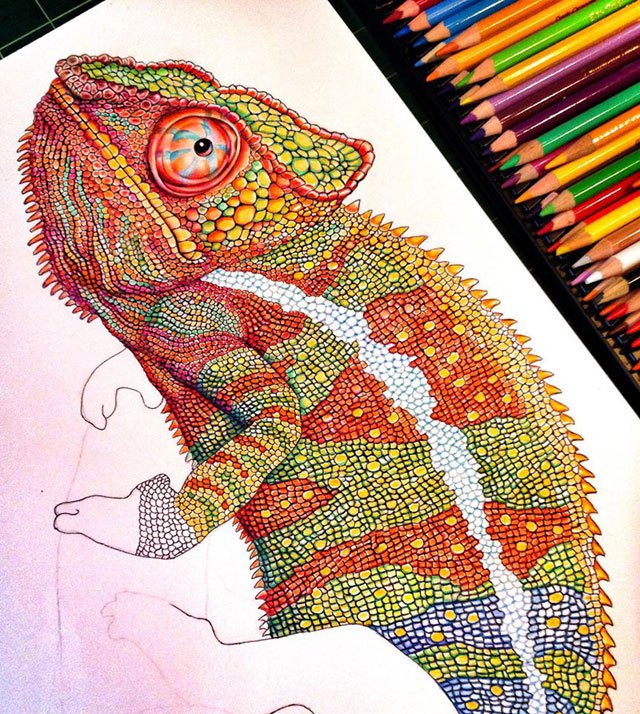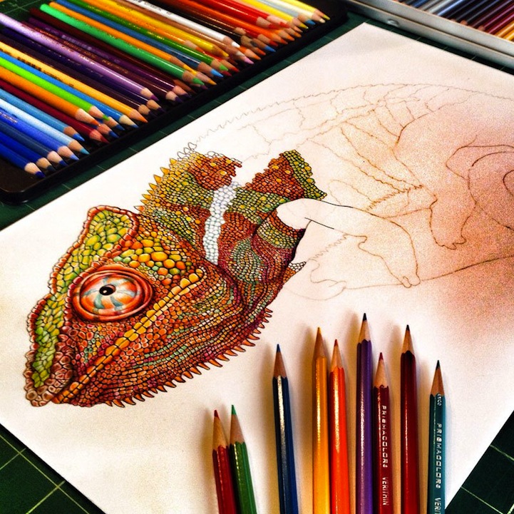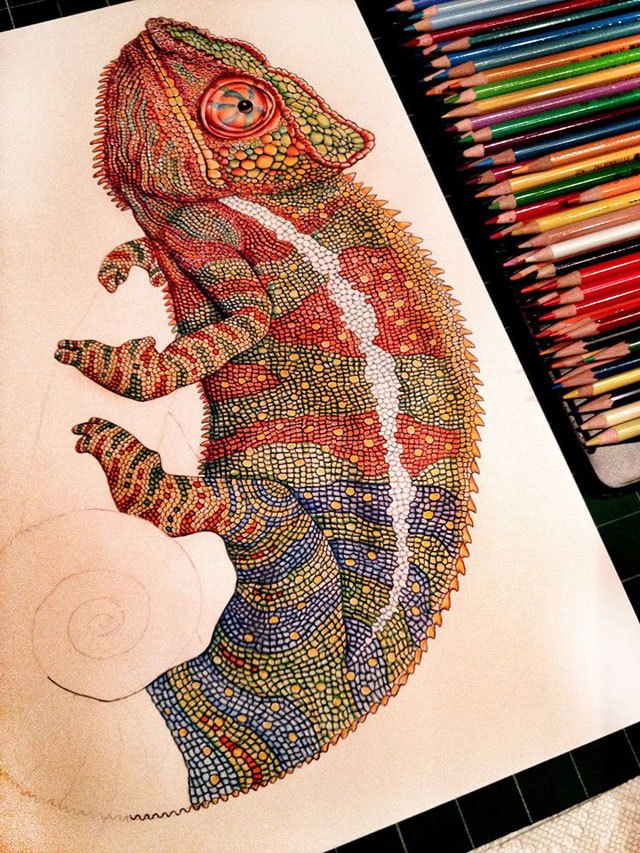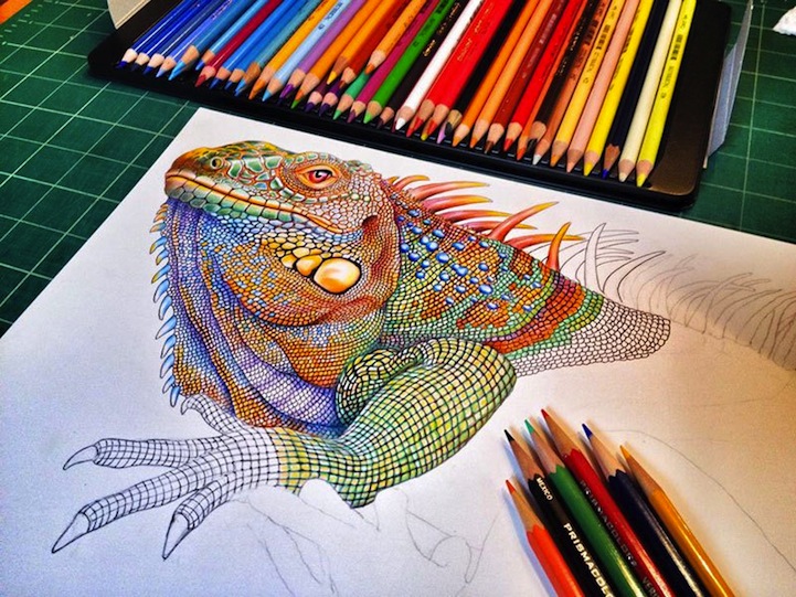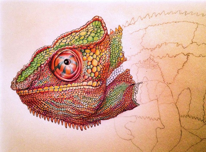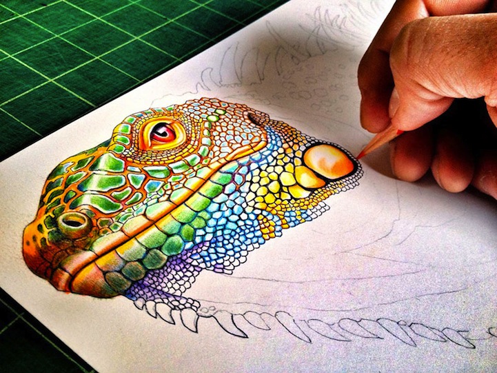 Artist Tim Jeffs brings vivid illustrations of regal reptiles to life with bold, black lines and brilliant pencil-crayon shading. The New York City-based artist starts a picture by drawing an outline that looks like a grid, which he then fills in with a beautiful spectrum of colored pencils. The grid “squares” transform into rainbow-colored scales, which function like individually shaded pixels to make up a brilliant, Technicolor image.