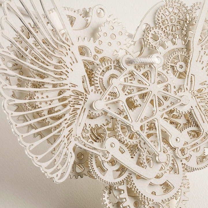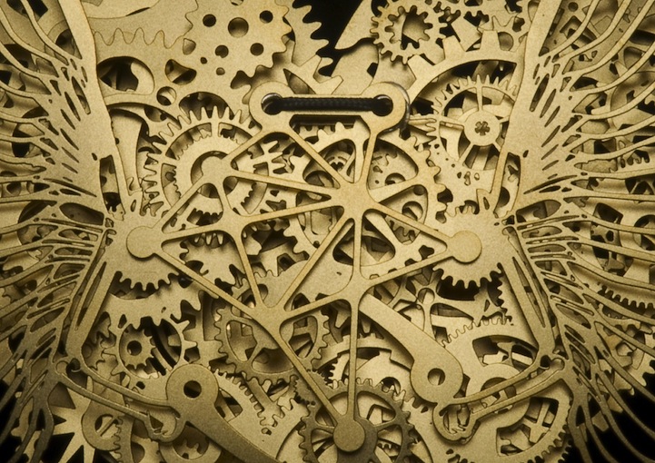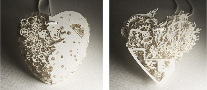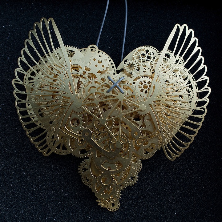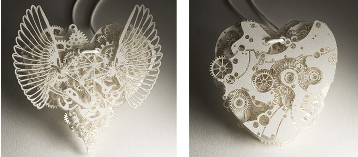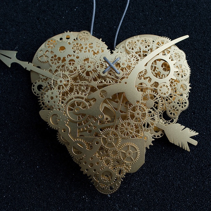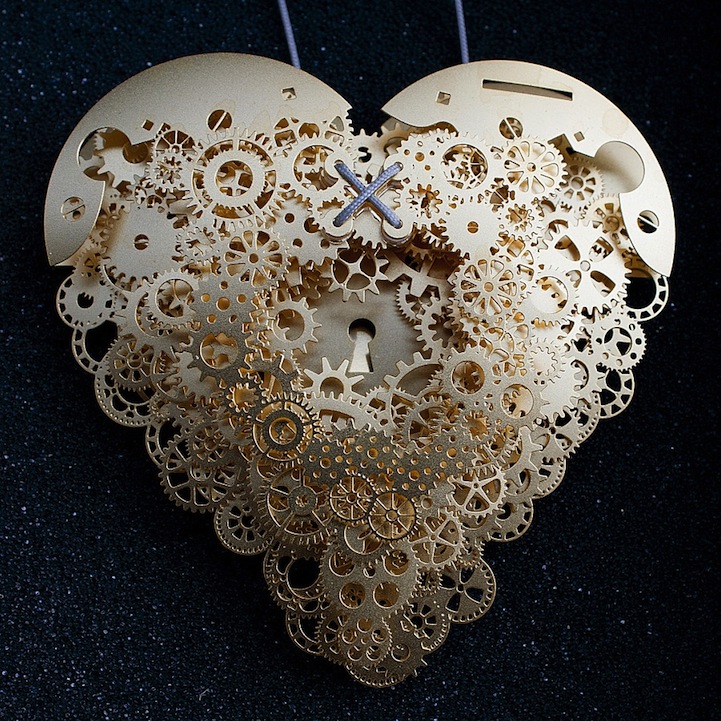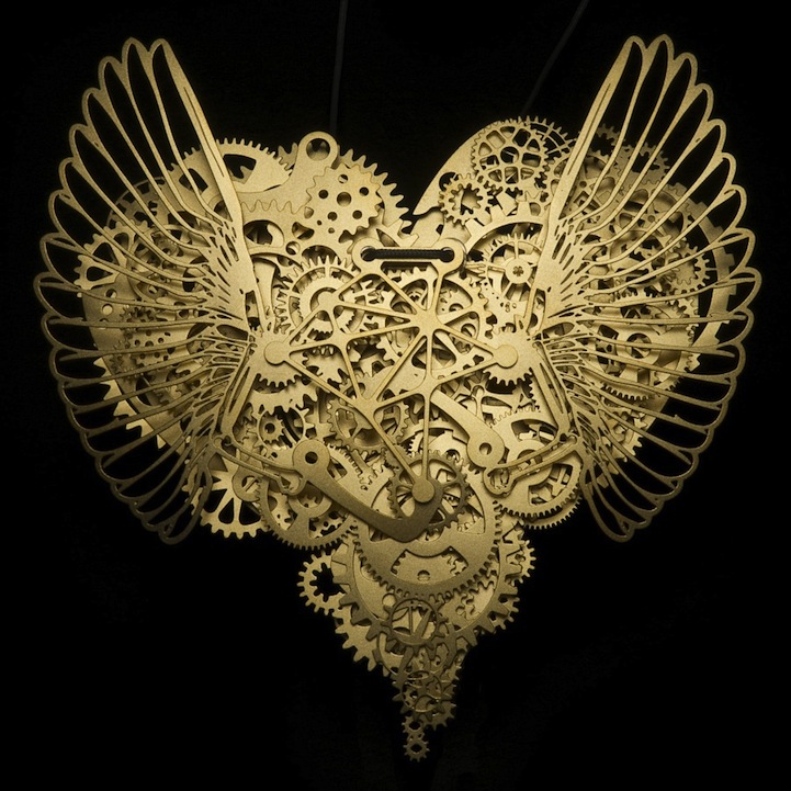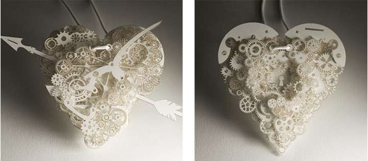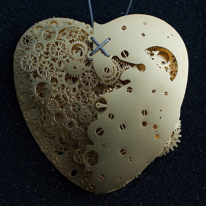 The heart is such a complicated thing, both physically as it beats to keep us alive, and emotionally in matters of love. These complex pieces are symbolic of the intricate structure and layers of delicate balance associated with a heart. Developed by designer Frank Tjepkema, or Tjep., the two bodies of work, Clockwork Love Gold and Clockwork Love Paper, are described as “A jewelry collection evenly and consistently combining a great multitude of graphic elements in a multitude of layers.”
