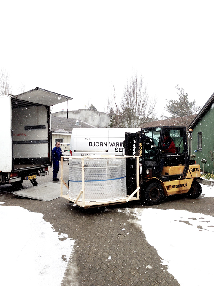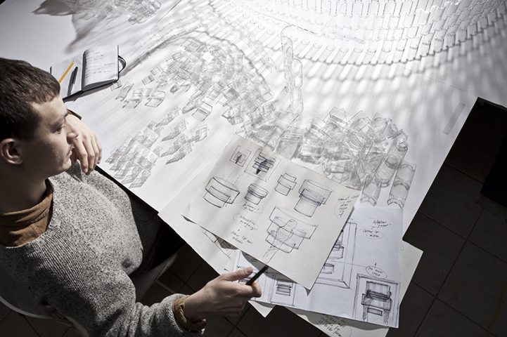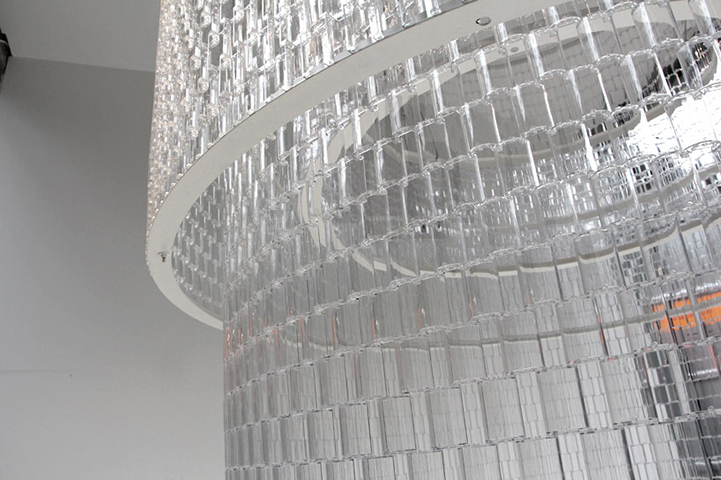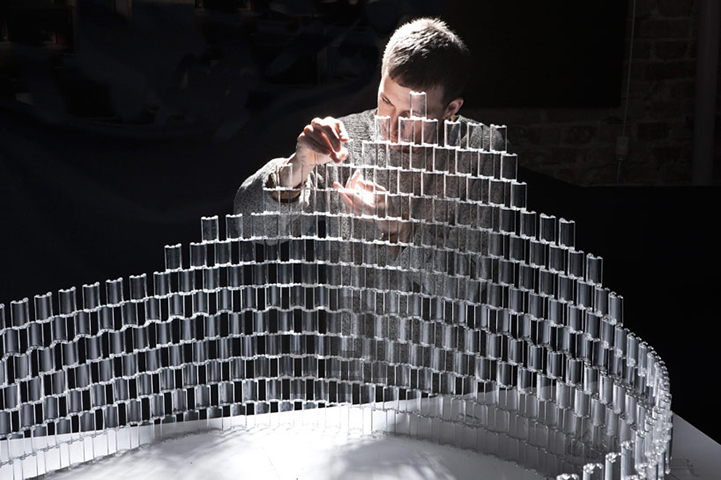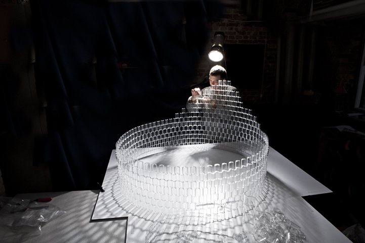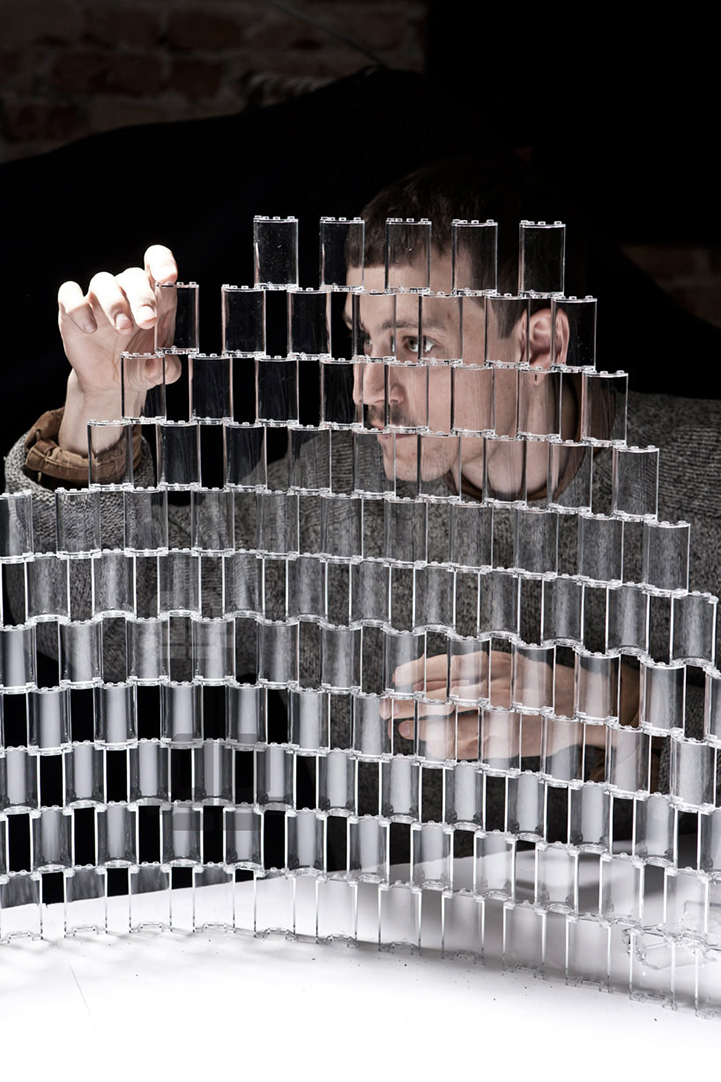 With extreme precision and lots of planning, Tstesen developed this functional design that was revealed at the 2013 Milan Design Week. Rather than the typical reds, blues, greens, and yellows of original LEGOs, the designer used 8,000 transparent plastic bricks to build the two-tier design in which light reflects through the curved shape in natural illumination. Tstesen says that the final product is complex while “still keeping a dialogue with the real world of architecture and design, where bricks, despite their ubiquity, persist to challenge human creativity and continually forge new paths.”