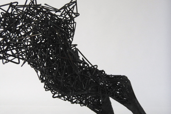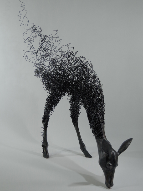 In one piece, viewers are presented with a grazing fawn, while the other displays a leaping deer. Both creatures have solid footing on the ground but extend beyond that point into a chaotic entwinement of wires. Though the fawn is half-way through its disappearing act, the active deer seems to have only just begun its disintegration process. Using a dark iron base and topping it with a similar pattern of clear acrylic resin, Inaba heightens the visual effect of gradual disappearance.
