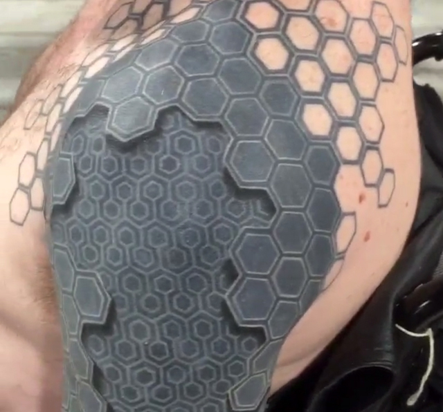 Tony Booth, a tattoo artist and owner of Dabs Tattoo in Southport, England, has successfully made a man appear as if he's an android. On his arm, at least. This incredible tattoo looks as though it's carved from the skin, and what's beneath it is another layer of hex geometric patterning. It's unlike any tattoo we've seen before.