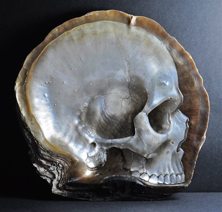 New Jersey-based artist Gregory Halili creates stunning bas-relief skulls delicately hand-carved and painted on mother of pearl shells. Inspired by the lush vegetation and tropical wildlife of the Philippines, where he was born and raised, Halili fuses the human form with the natural world in these lovely, intricate works of art. See more, here.