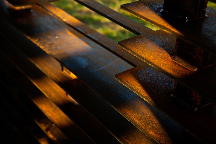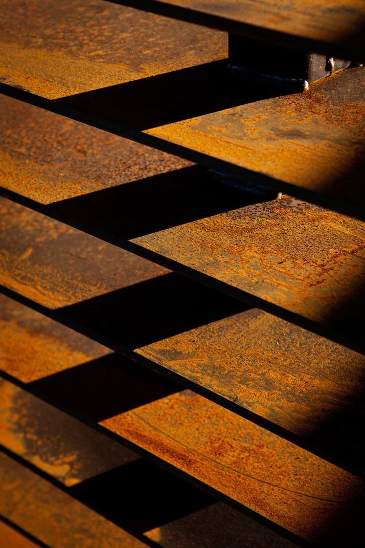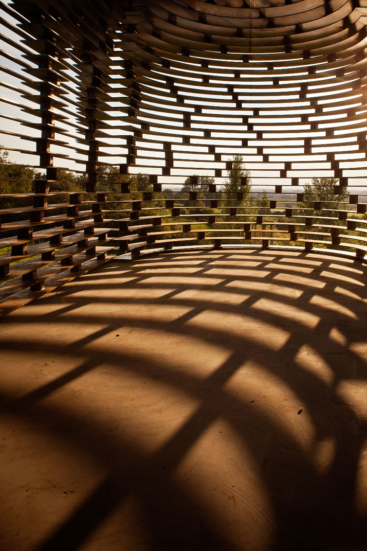 As one changes their perspective, the church becomes more solid one way and less solid the other. It seems to disappear into the surrounding environment at just the right angle. Also, as the sun sets, the interior of the church changes as well. The light is filtered in through the gaps, creating a spiritual feeling.