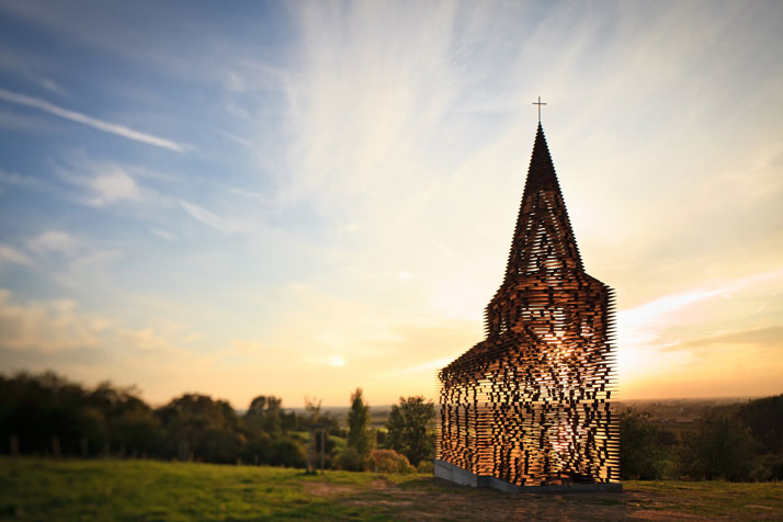 Architects Pieterjan Gijs and Arnout Van Vaerenbergh, partners behind the firm Gijis Van Vaernbergh, are in the process of installing their newest creations all around the Netherlands. It's a series of 34 ft. tall steel churches, each made out of 100 stacked layers of steel and 2000 steel column plates. The project is entitled “Reading between the Lines.”