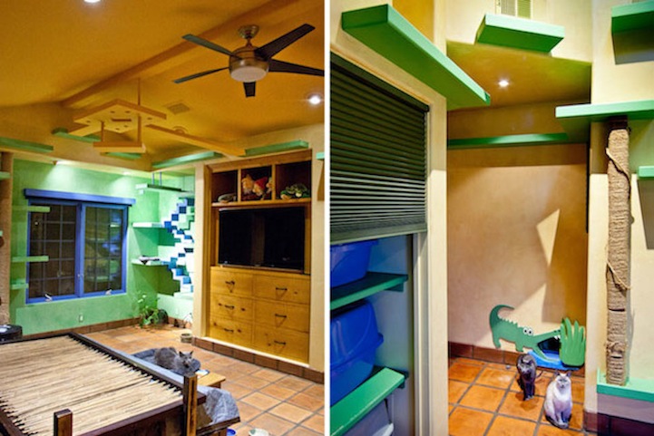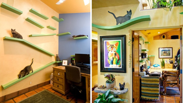 With the help of construction company Trillium Enterprises, one Californian man upgraded his home into an oasis for his eighteen cats. Located in Goleta, California, the $35,000 renovation transformed the ordinary abode by adding colorful, complementing ledges (or “catwalks”) all around the house. Every room, from the master bedroom and personal office to the kitchen and bathroom, has playful accommodations for the owner's furry little friends.