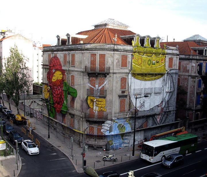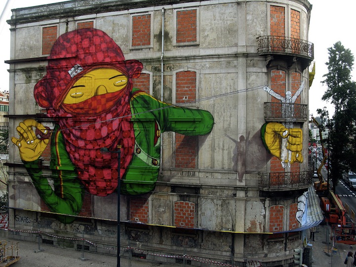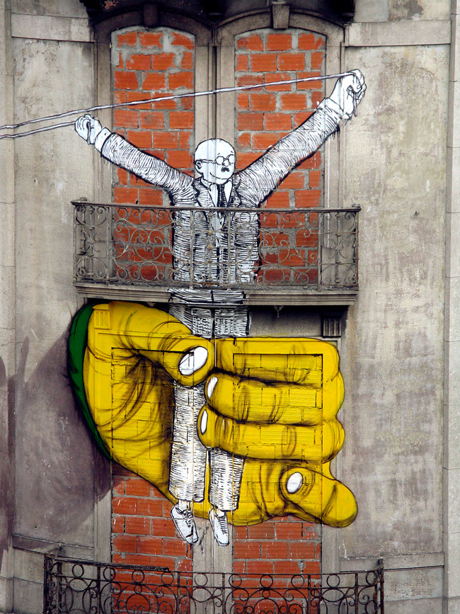There's a lot going on in this collaborative piece by artists Os Gemeos and Blu. If you look closely at the huge mural which covers two sides of a tall building, you'll notice that the man sucking the globe wears a crown adorned with oil company logos. The piece is timely considering what's going on in the Gulf of Mexico. Hopefully that dude with a human slingshot will take him out.