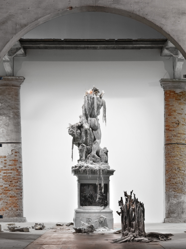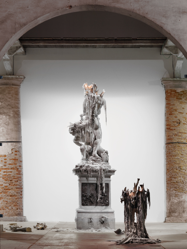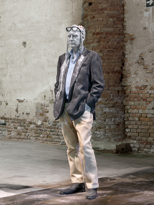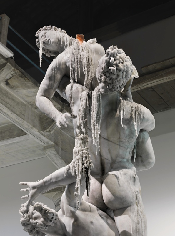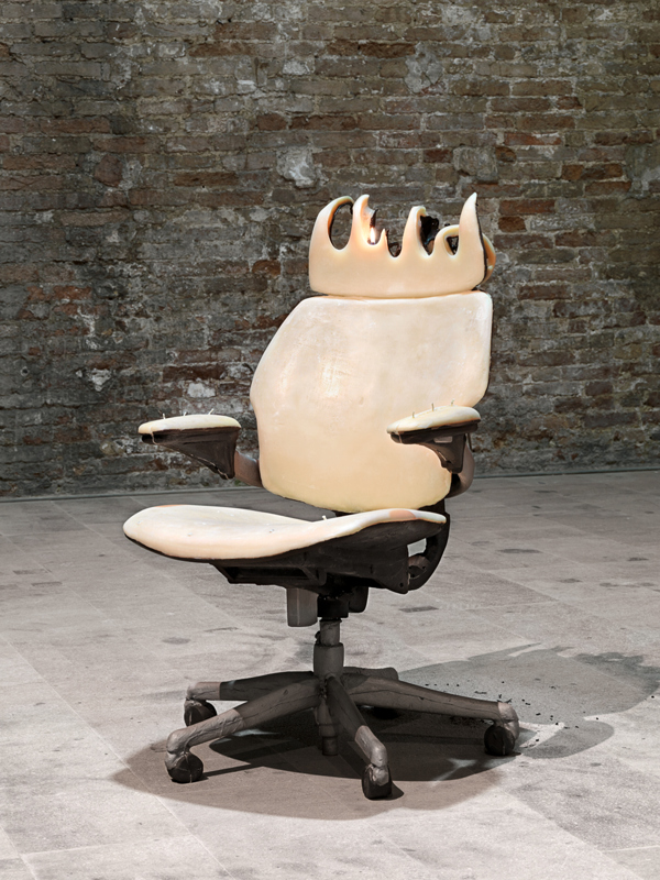 Fischer's intriguing re-imagining of Giambologna's marble sculpture from the late Renaissance, titled The Rape of the Sabine Women, depicts the evolution of a solid, intricately detailed figure into a deconstructed, hardened puddle of wax. What's most fascinating about this installation as a whole is that the wax figures up on the pedestal are not the only works of art that are destined to soften and mutate into an abstract version of themselves. There is a deceivingly realistic office chair and an onlooking man that, too, are wax statues with lit wicks doomed to face the same fate.