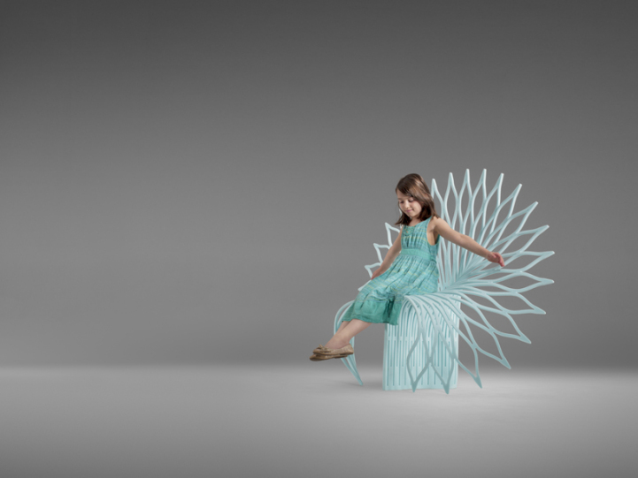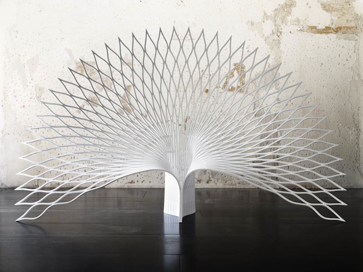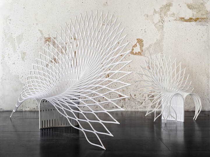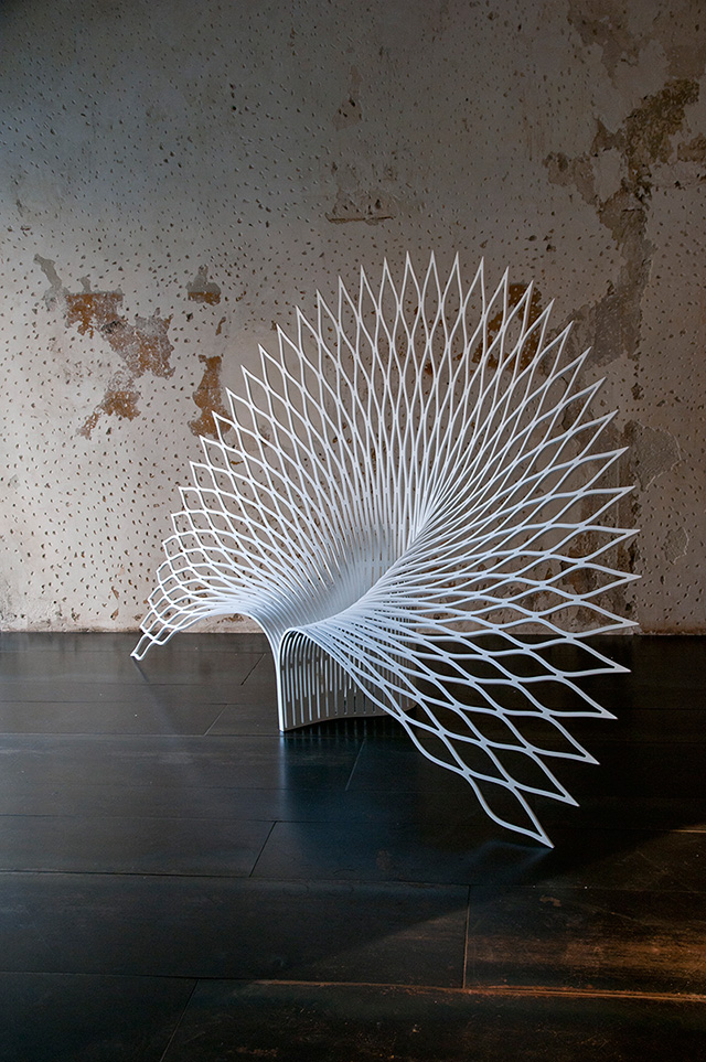 Constructed out of a single sheet of acrylic, the design features a beautifully elegant back rest that fans out much like its namesake bird's plumage. Its simple, open pattern also casts a stunning shadow over the floor, adding a dramatic effect to the chair's overall visual appeal. What is most striking about this design, though, is how completely imposing yet simultaneously delicate it appears, almost like a throne made of lace. Despite its delicate appearance, the material has been thermoformed, making it completely structurally sound.