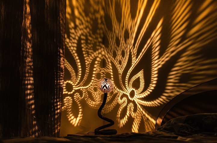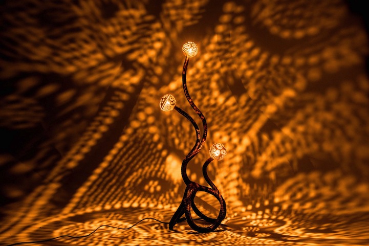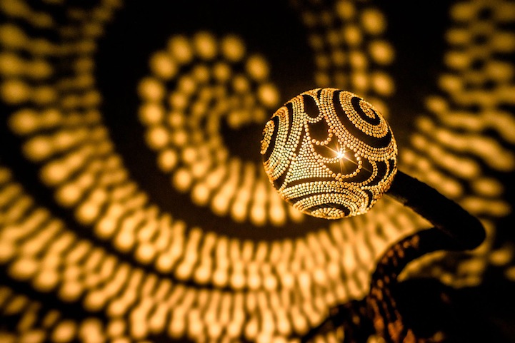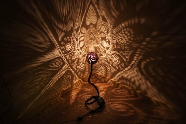 Artist Vainius Kubilius carefully crafts lamps that project visually exciting and exotic patterns of light on adjacent walls. Unlike your typical light designer, Kubilius doesn't simply work with metals and manmade materials. Instead, this creative innovator incorporates coconuts into his products, which he designs under the label Nymphs. “The head of the lamp is made out of coconut,” Kubilius tells us, “but after careful shaving, waxing, and drilling, it shines like some sort of jewel.”