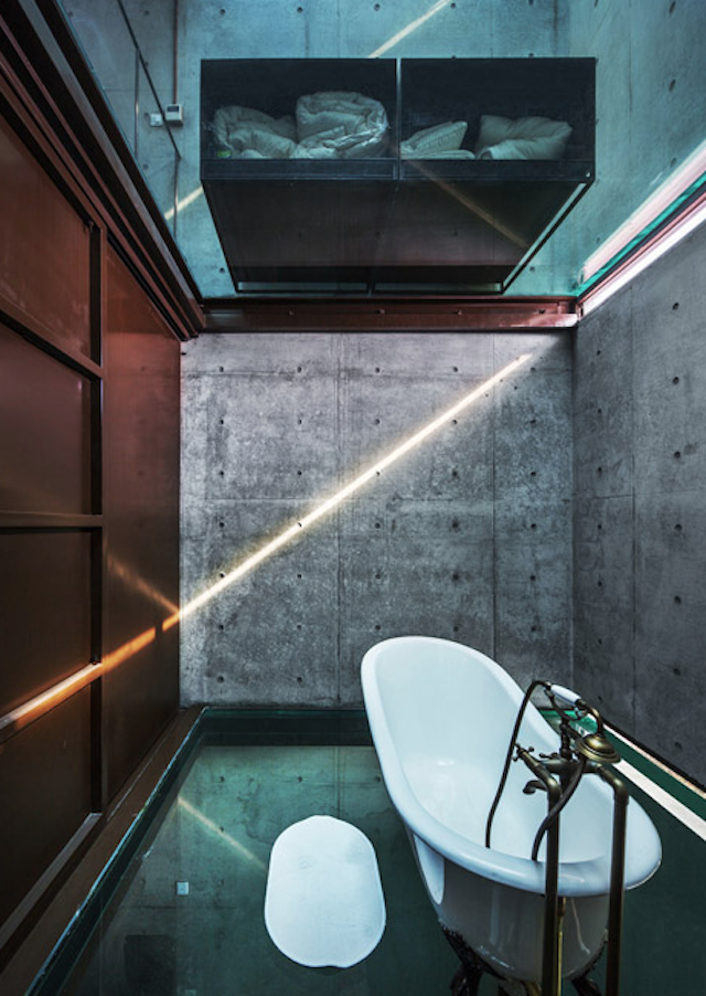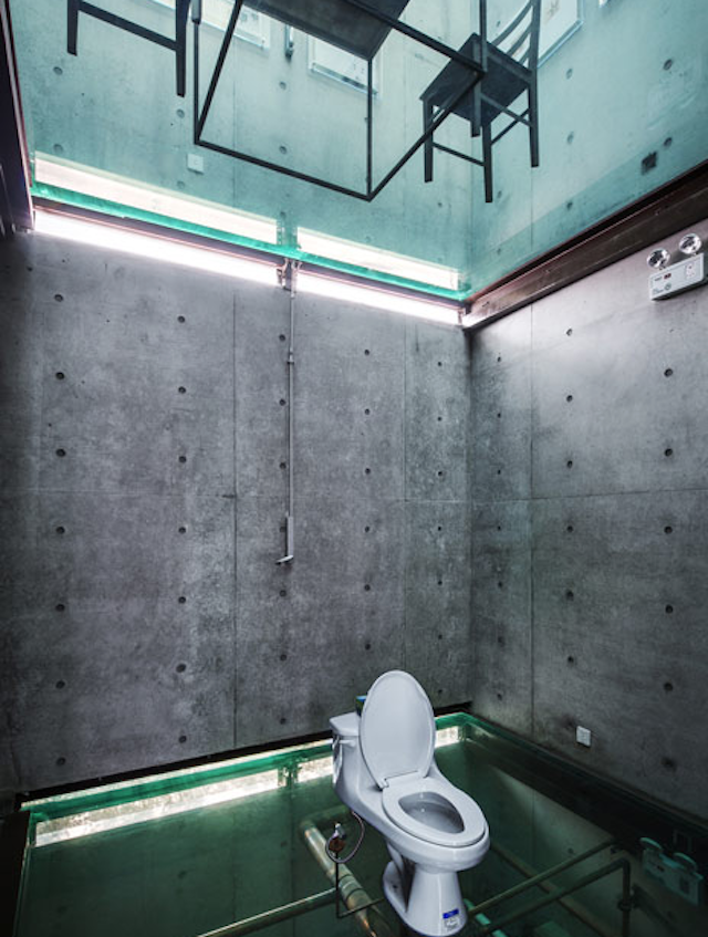 Vertical Glass House, a four-story building in Shanghai, China, proves that architecture has the ability to be both inconspicuous and provocative. Designed by architect Yung Ho Chang of the firm Atelier FCJZ, the outside of this house has a very simple, unassuming concrete facade that's broken only by a few small slits that emit light. By contrast, the roof is completely transparent, as is the inside of the house where the interior boasts tempered glass floors. Aside from the occasional panel to support things like the spiral staircase, each room of the house can be viewed by simply looking up or down. While innovative, this choice eliminates privacy and promotes voyeurism, even when using the bathroom, as the toilet and tub are both left uncovered.