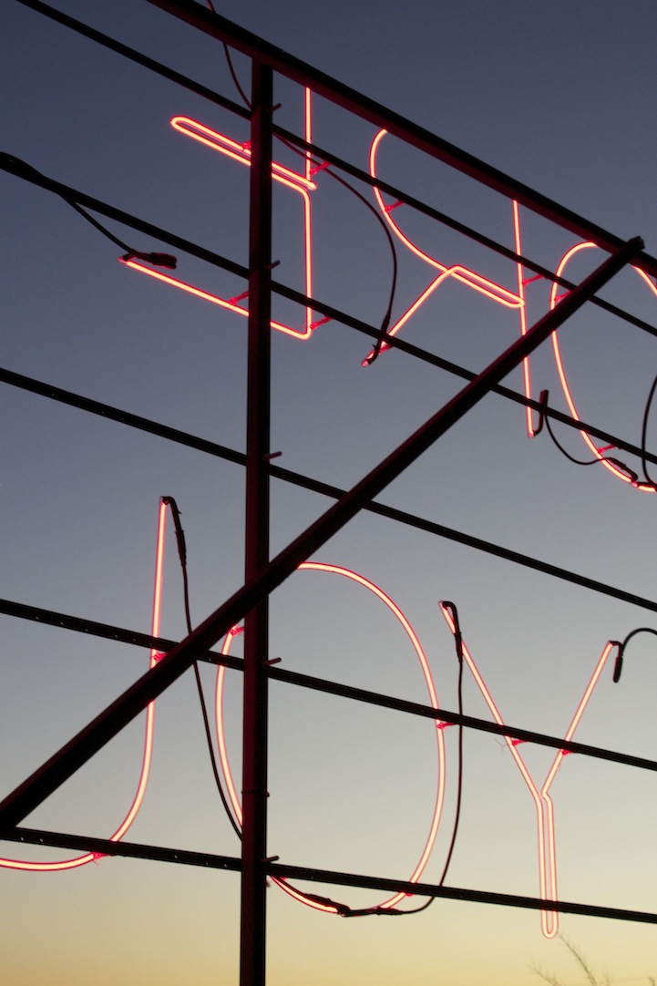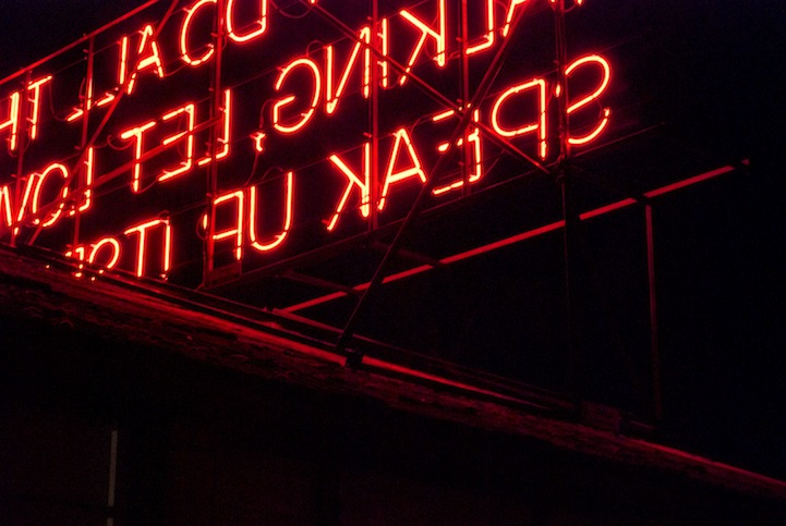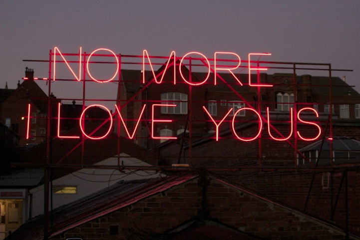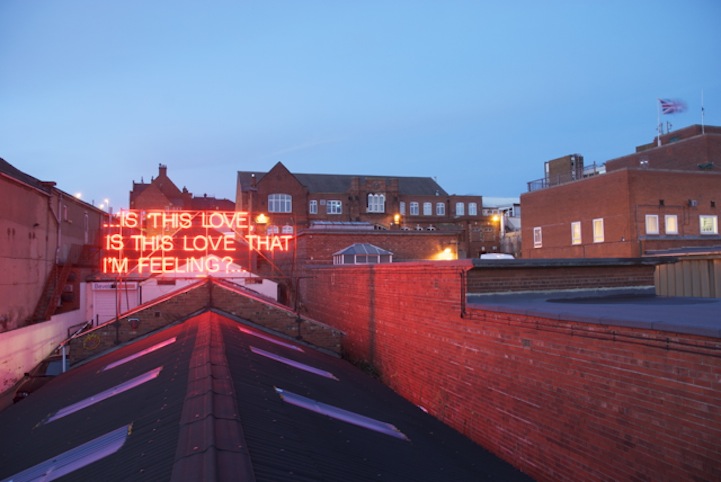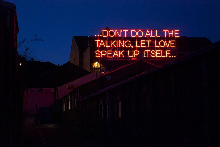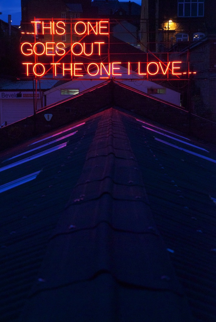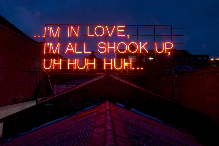 Artists Victoria Lucas and Richard William Wheater have collaborated for the past year to create this glowing, self-funded public project entitled 12 Months of Neon Love. Featuring lyrics from popular songs, the team produced a series of twelve expressive signs that were displayed on the roof of their Neon Workshops in West Yorkshire, England. For one month, red snippets of song lyrics including “Love is a losing game…” and “No more I love yous” glowed from the rooftop as a visual representation of the complexities of love. Commuters on passing trains could catch a glimpse of the fleeting words as the train zipped by.