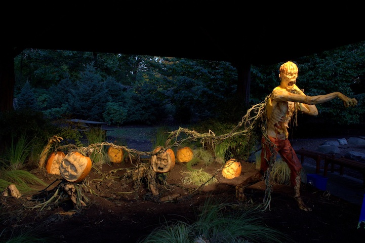 This year, a life-size, 6-foot tall standing zombie with its insides oozing out, is seen holding a bundle of pumpkin vines, pulling other zombies out of the ground. The team started out at Grand Central Station and then ended up at the New York Botanical Gardens in the Bronx where their incredible carvings will be on display until October 31.