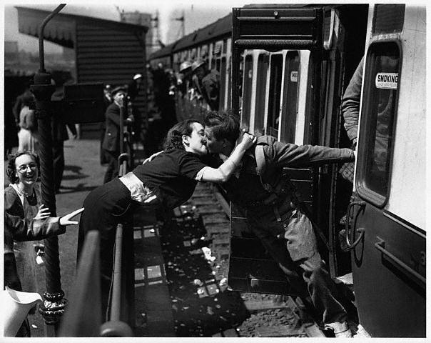 London, 1940 – A soldier kisses his sweetheart over the gates of a London railway station as he heads off to join the British Expeditionary Forces in France.