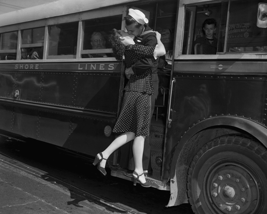 Seattle, 1948 – A sailor kisses a woman as he boards a bus at the Seattle Bus Terminal.