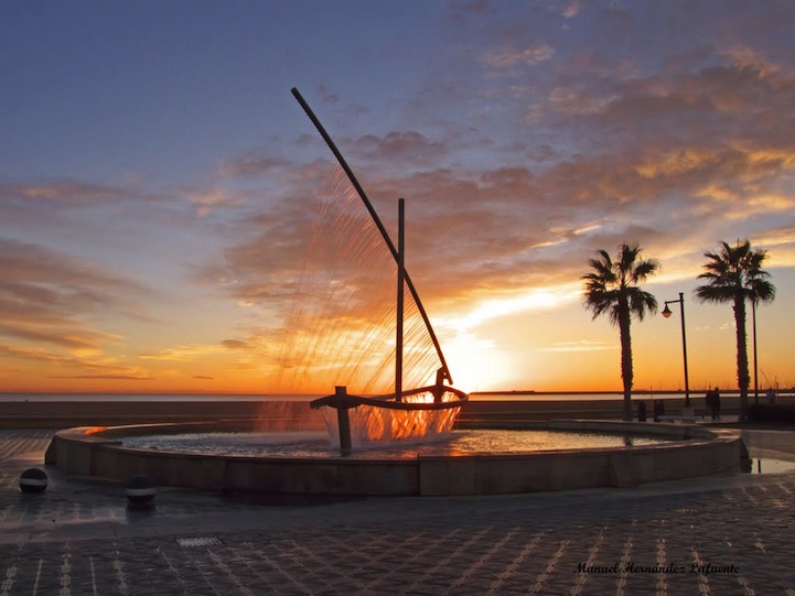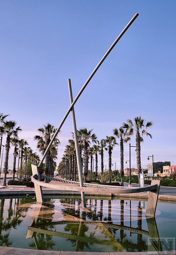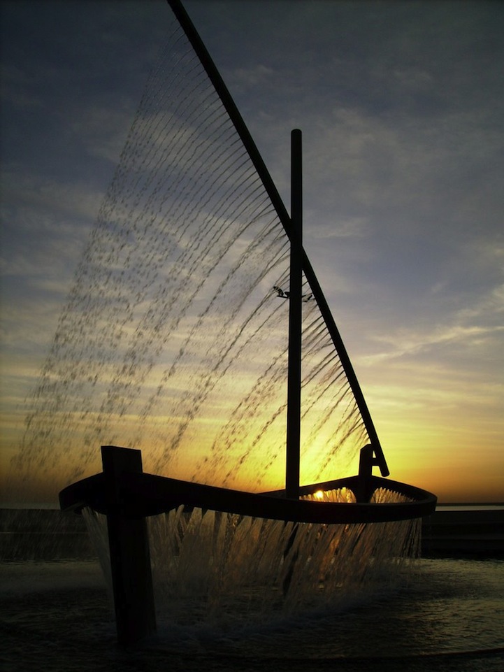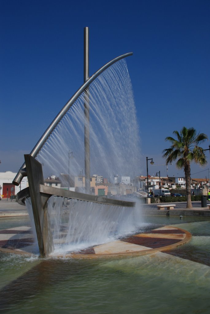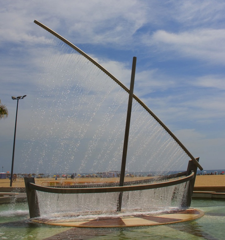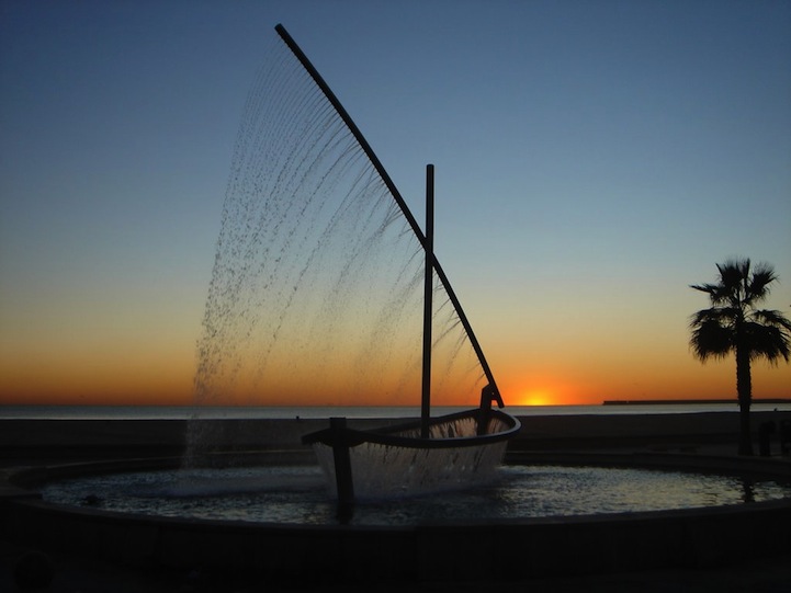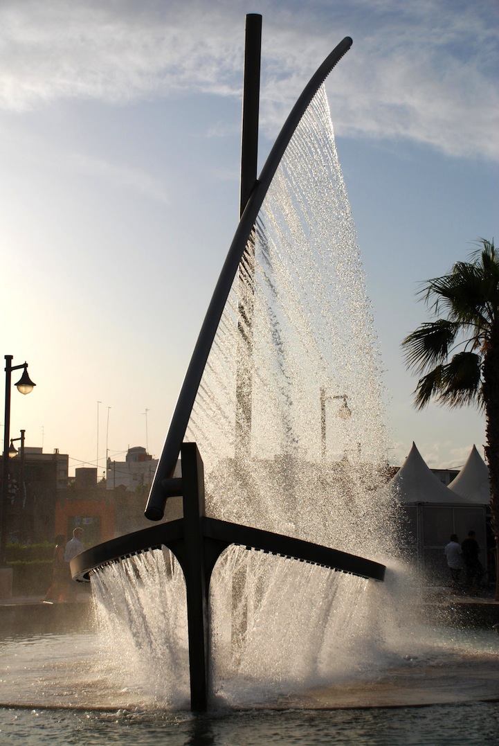 At first, the image above looks like a boat, one that is caught in a soaking surge of water, but it is in fact a cleverly designed fountain sprinkling water out of its man-made pores. Located at Playa de la Malvarrosa in Valencia, Spain and known simply as Water Boat Fountain (or Fuente del Barco de Agua in Spanish) by visitors and locals alike, the sculptural fountain creates the illusion of both the hull and the sail of a boat with liquid jets. One is left baffled by its simple design mimicking the appearance of a sailboat with nothing more than a few rods spraying fine streams of water.