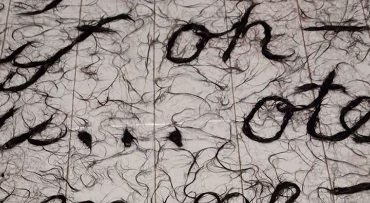 For the extensive piece, Gu collected hair from 325 barber shops and hair salons throughout 18 different countries on every continent. He covered more than 100 panels with hair woven together into beautifully scripted lettering based off of Chinese, English, Hindi, and Arabic. The stunning exhibit creates a stained glass effect throughout the room as light shines through the semi-transparent panels. Viewers will immediately attempt to read and make sense of the words, but will quickly discover that the language and lettering is fragmented and illegible.