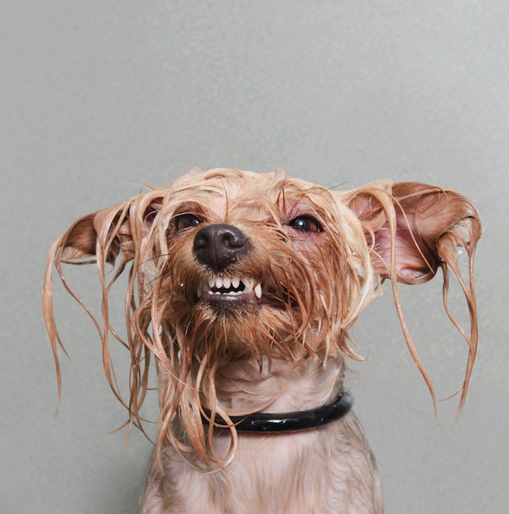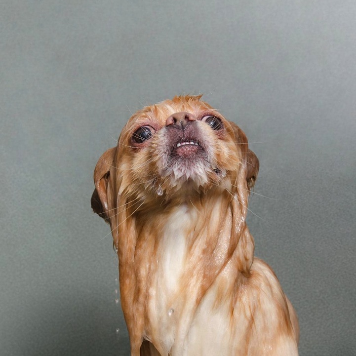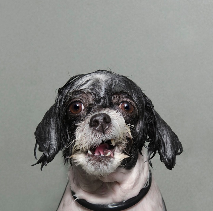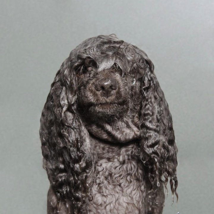 “Wet Dog is a series on dogs being washed during their grooming sessions. The way the water plays with their hair in a very painterly manner, and their facial expressions as the water is poured on them creates striking portraits that resemble famous humans or important characters. The dogs become timeless sculptures.” – Sophie Gamand