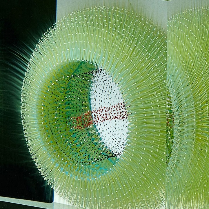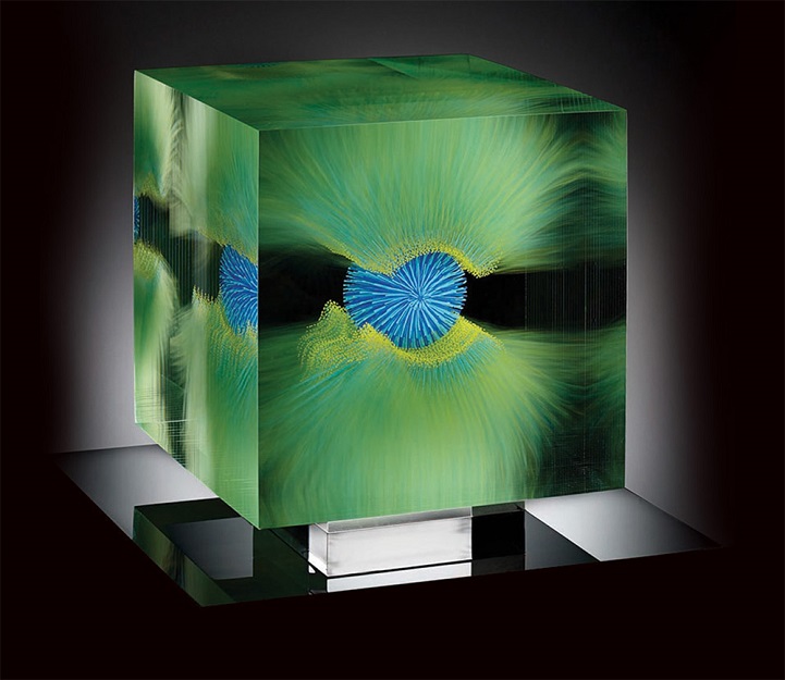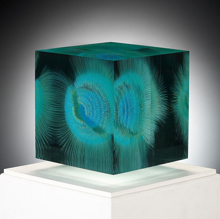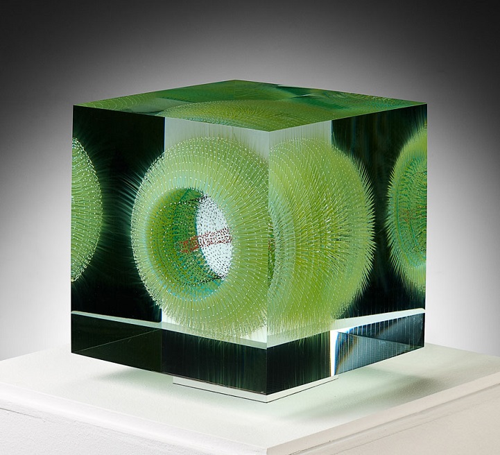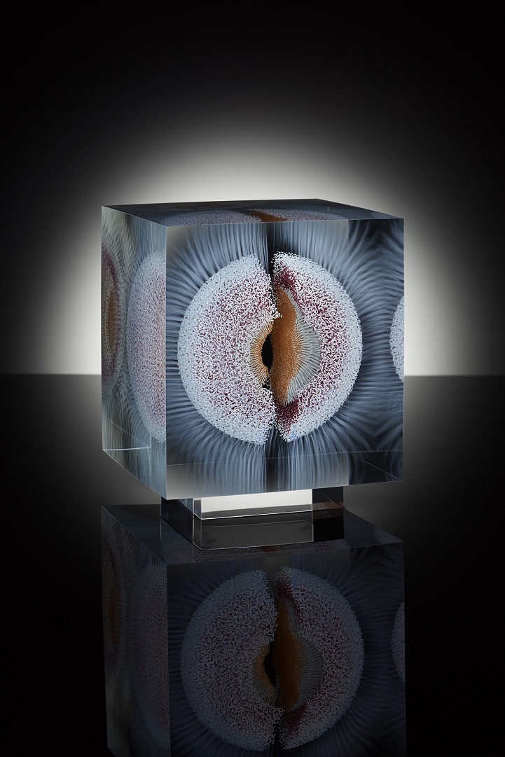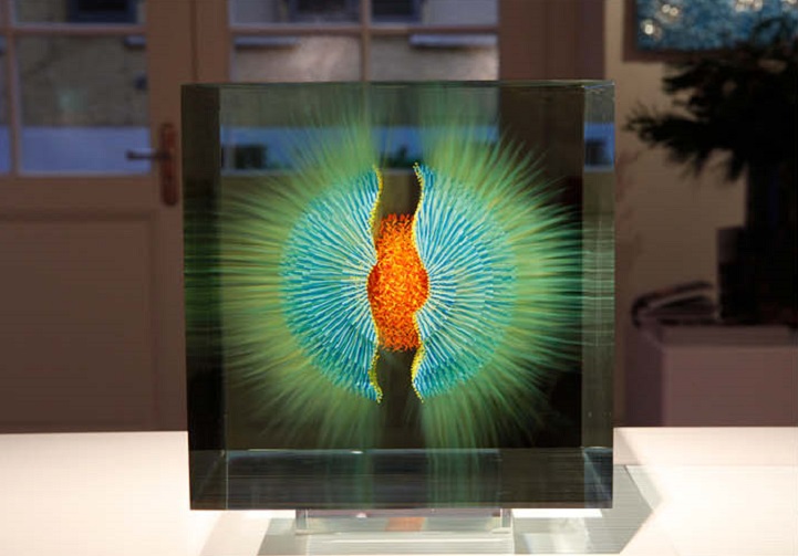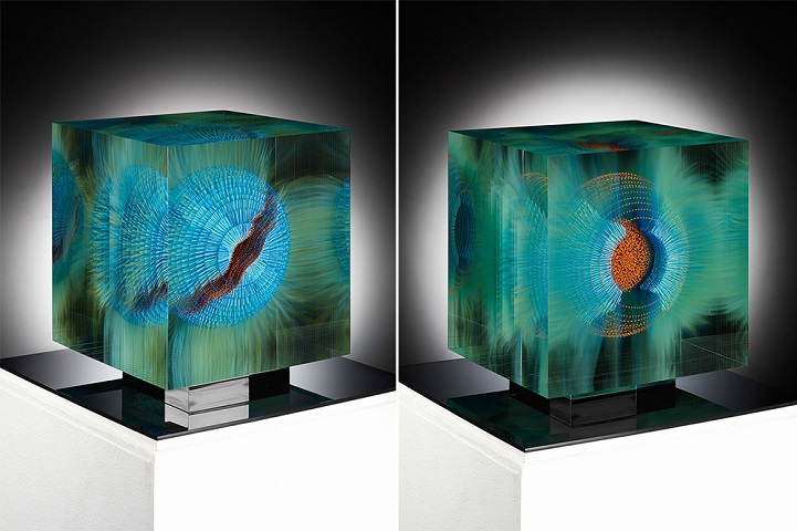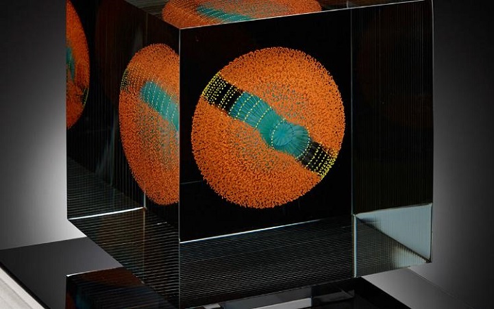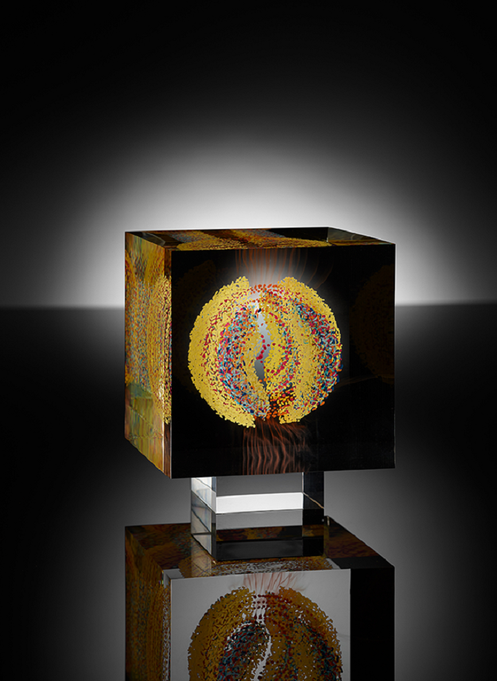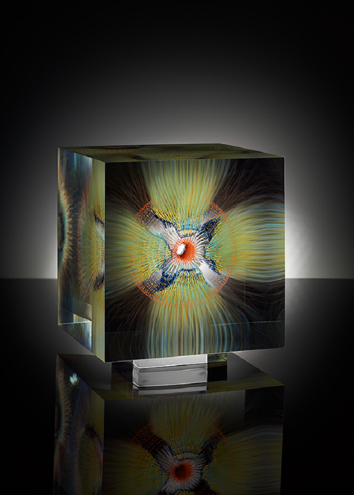 Grootens apprenticed as a glass painter at a young age, before departing on a 10-year adventure to travel the world, including Asia and South America. Eventually he returned to his craft, furthering his studies in glasswork and eventually opening his own studio. With his glasswork, Grootens fills “transparent geometric spaces [with] visual explorations [and] surprising shape variations.” Known for his style of precise, linear brush strokes that form stunning floating spherical images, the artist draws inspiration from natural phenomena, with pieces resembling microscopic organisms or the first few milliseconds of an atomic explosion, frozen in time.
