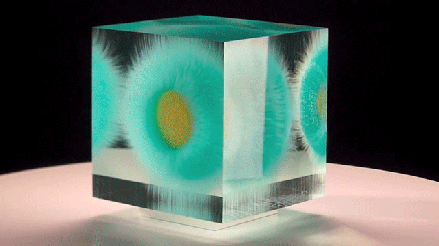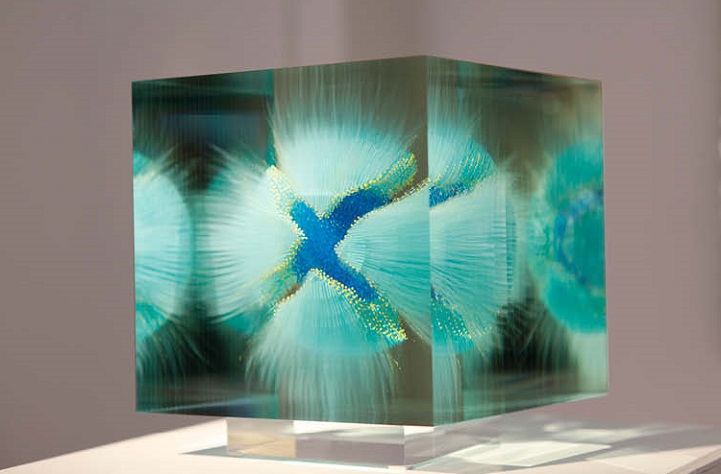 Glass painter Wilfired Grootens is an artist from the German countryside with a very unique style. Using delicate swirls and tendrils painted onto layers of laminate glass, he assembles dozens of sheets together, and then sands them down to produce vivid three-dimensional paintings that appear to float in mid-air. When examined from different angles, his sculptures vary, perspective playing a huge role in each piece to successfully meld art with optical illusion.
