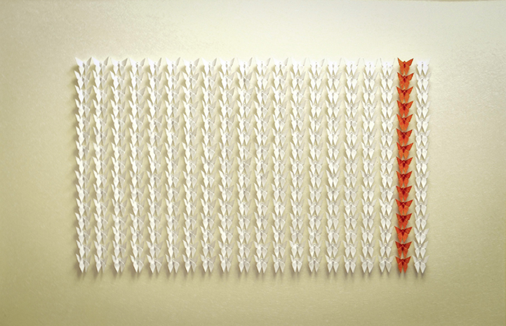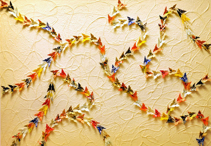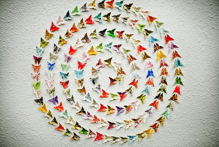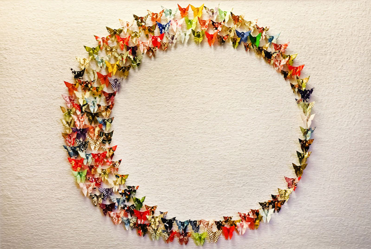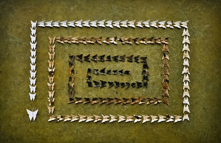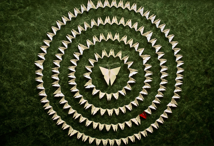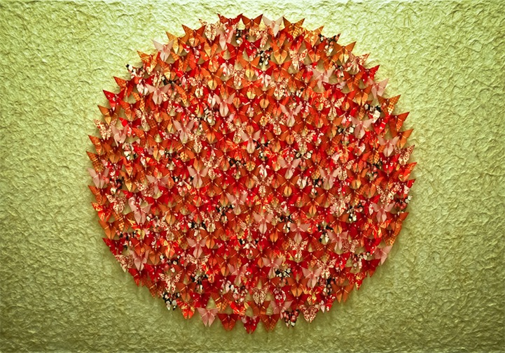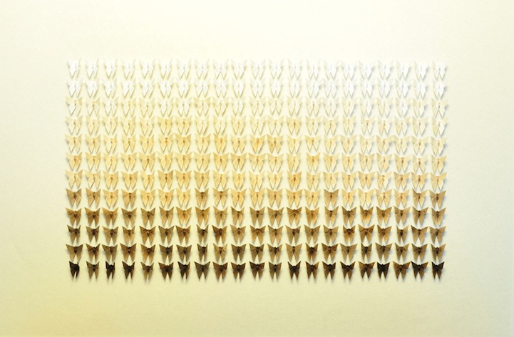 Will & Caro create delicate pieces using mainly washi (Japanese paper), focusing on simple forms made with fragile material. Wong's intrigue with Japanese culture and Du's interest in movement and disorder are a perfect combination for their collaborative designs. Each piece features tiny paper butterflies, organized into perfectly symmetrical shapes that evoke a certain energy and life in the motionless forms. According to their website, “The inspiration lies behind nature in that it's design is both deliberate and effortless which is reminiscent in some ways of the life experiences unique to each individual.”