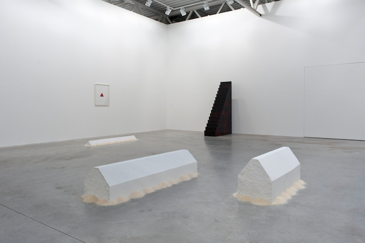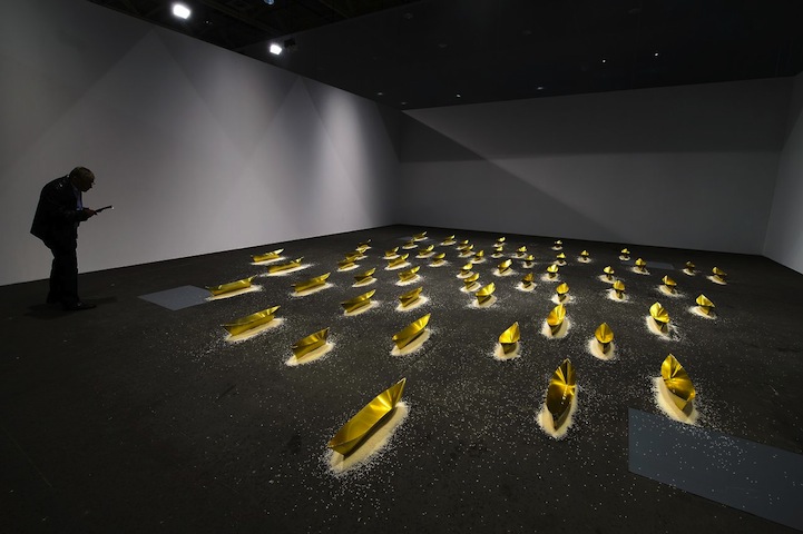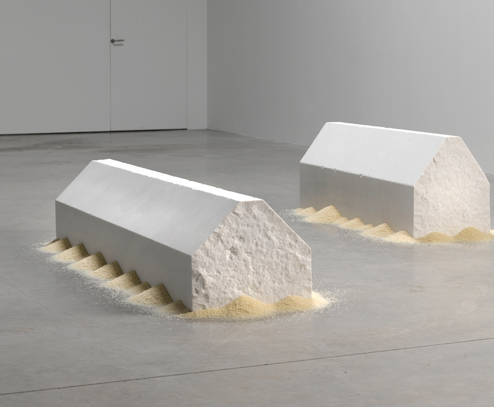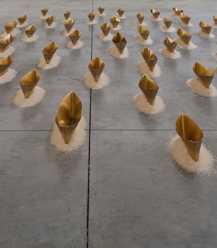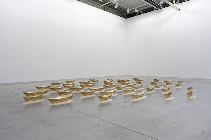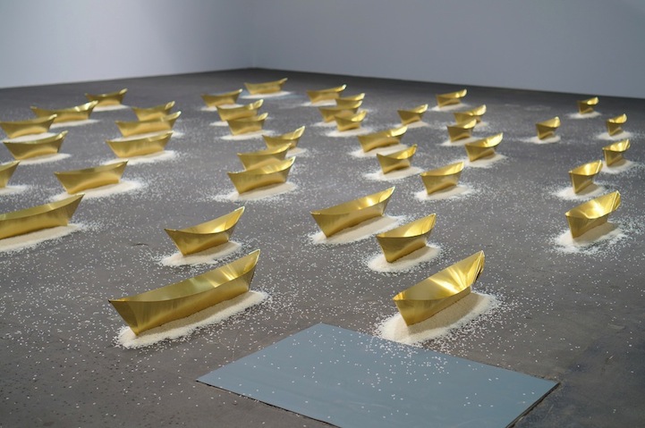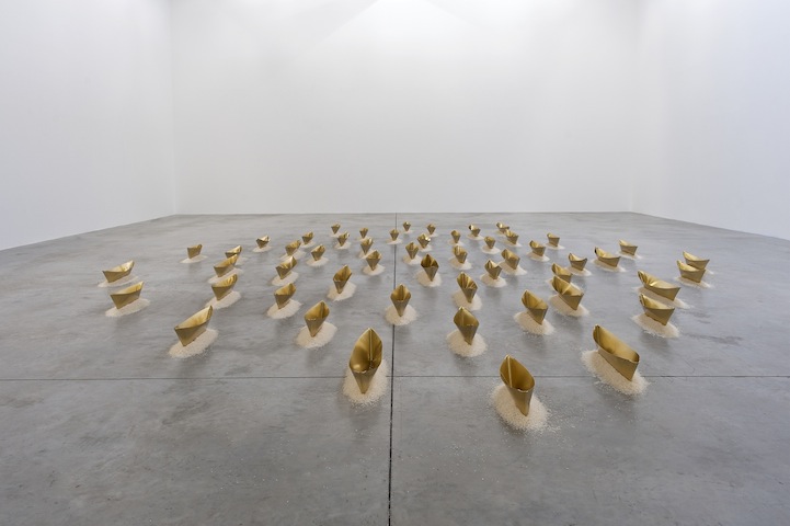 Passageway, Inside-Downside is a recent installation by German conceptual artist Wolfgang Laib and presented by Galerie Thaddaeus Ropac. The piece consisted of small brass boats sitting on top of mounds of rice and arranged precisely along a gallery floor. Alongside the small, organized grouping were also ten drawings and several monumental sculptures that all worked collectively together to produce calm, meditative thoughts.