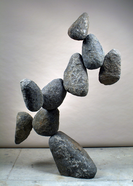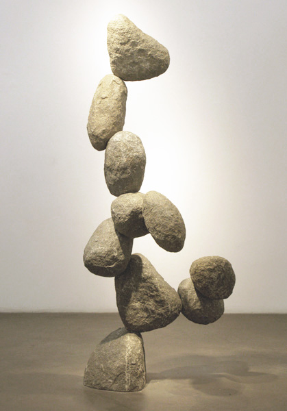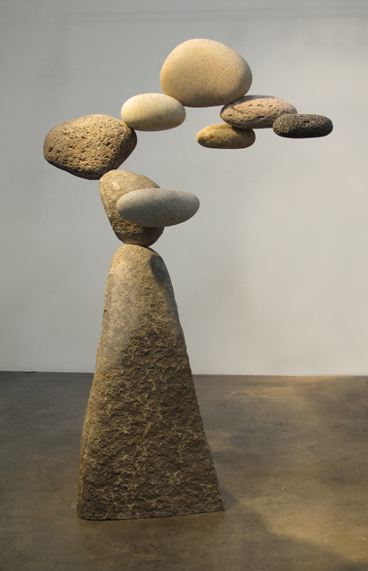 Davy's Cantamar series, named after the small town in Mexico from which the rocks were gathered, presents sculptures with a serene formation of the pale yet colorful stones. With the aid of hidden steel, each piece is assembled in such a way that they reflect the rolling waves of the tides that shaped and transported the rocks across the Mexican beach. There is something both natural and inorganic about them. Similarly, Davy's Granite series incorporates heavy boulders in gravity-defying compositions. The difference with these works is that they are far bulkier and imposing with a lower center of gravity.