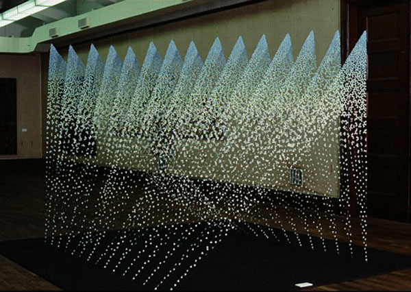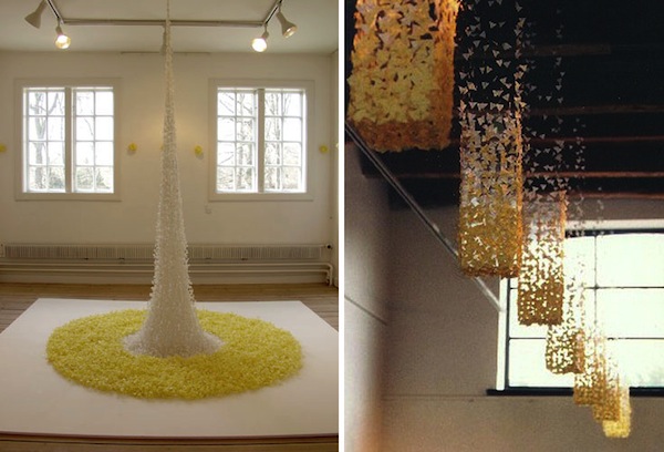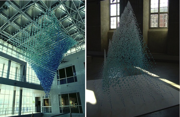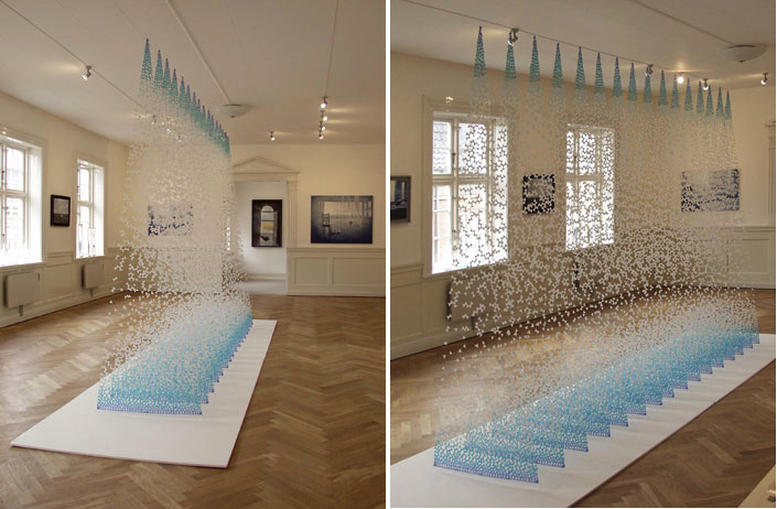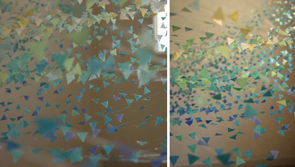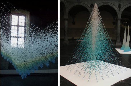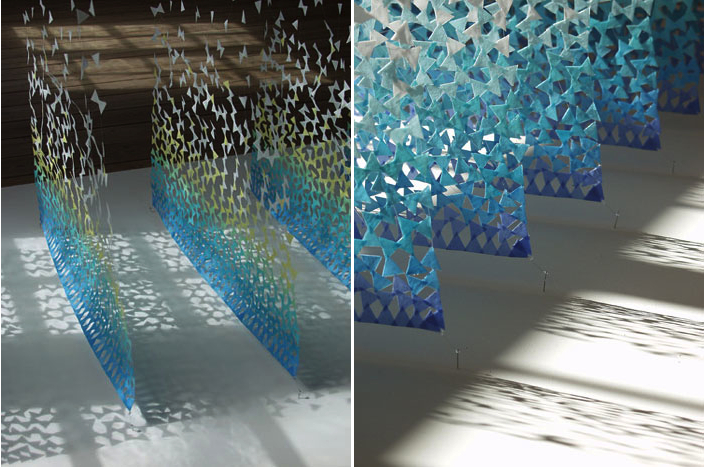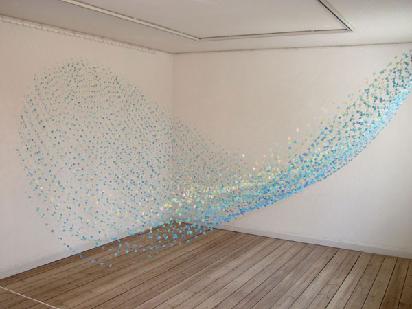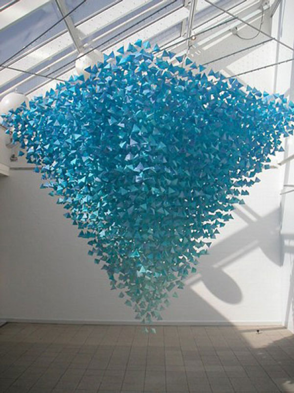 Denmark-based Japanese artist Yuko Takada Keller creates delicate paper installations that wash a sense of calm and ease over the viewer. Each of her suspended constructions utilizes countless triangular pieces of tracing paper meticulously dyed in refreshing, pastel hues. Each fragmented piece of paper is assembled with glue, transforming them from a collection of minute, disconnected shapes into one three-dimensional entity, just like molecules and cells.