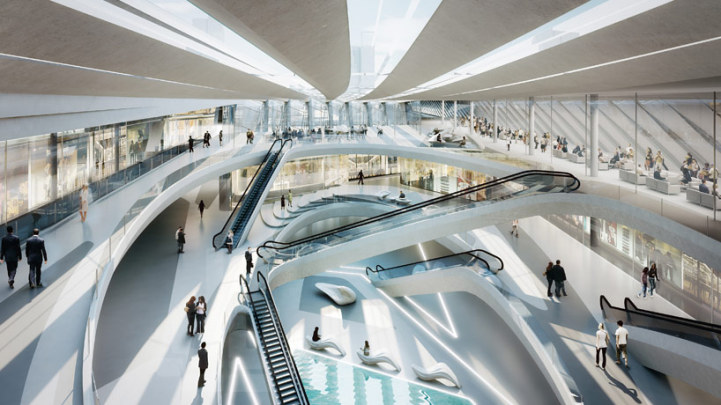 What stands out about this concept is the building's folding roof that allows for added ventilation and lighting. Swooping arches and curved beams make up the interior space, creating a nice juxtaposition between the outer linear facade and curvilinear interior. A new number of fluid pedestrian pathways have also been added to help circulate congested foot traffic and heighten the design's sense of motion. Additionally, many of the site's abandoned and rundown spaces will be re-purposed, including an old ballroom that is set to become a brand new event space. The station's proposed transformation will also include retail spaces, a hotel, and even a fine dining restaurant.