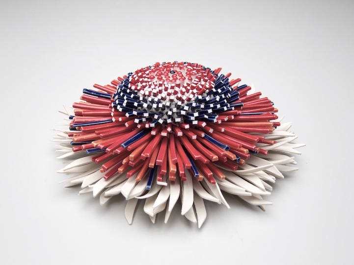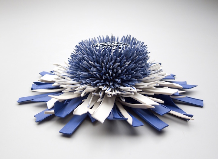Using thousands of ceramic shards, Israeli artist Zemer Peled constructs sculptures that resemble beautiful blooming flowers. The intricate works combine a variety of colors and designs, most notably cobalt blue that's used in traditional Japanese pottery. Peled arranges the shards according to their length, color, and shape. The similar-looking pieces form long petals with a dotted, stamen-like center.