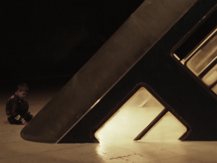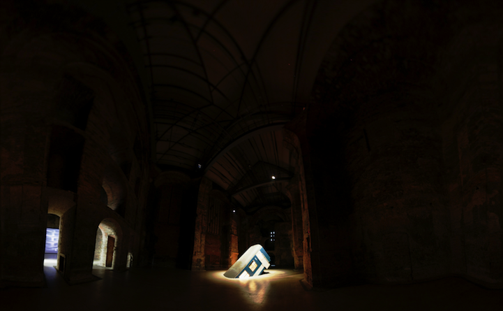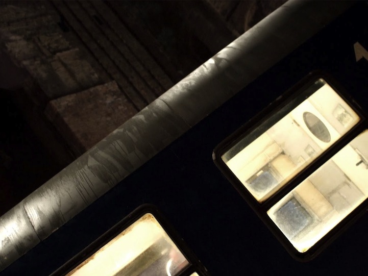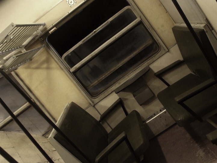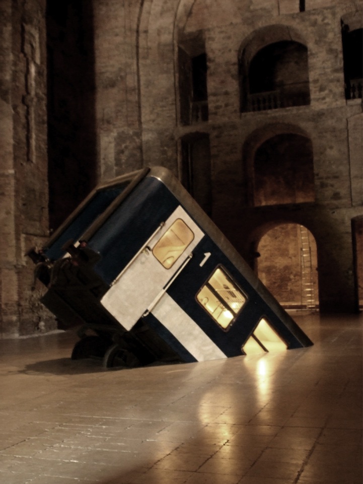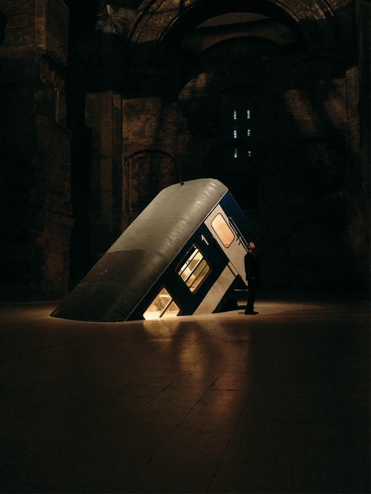 Hungarian artist Zsuzsi Csiszer's installation titled tjrs, which translates as Passage, features half of a train car bursting through the floor in the Templespace of Museum Kiscell. The site-specific work brings many thoughts and questions to mind due to its large scale and unusual location within an 18th century temple hall. The life-size sculptural installation leads one to believe that the carriage has inexplicably crashed into the ground.