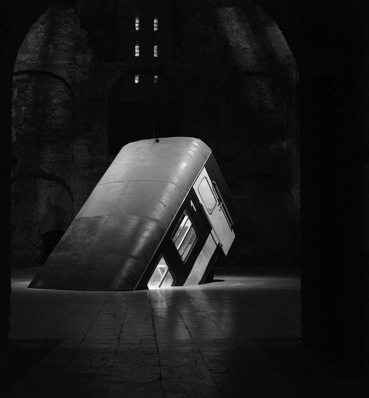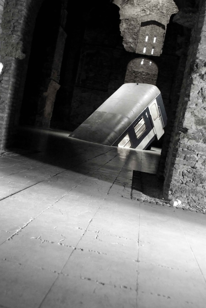 Like Ivan Puig's sinking Volkswagen Sedan, the locomotive in this piece appears to be caught in time amidst a catastrophic downward propulsion, though there is no real evidence to prove this. The artist challenges the viewer's preconceived notions about what has happened or is happing in this frozen scene by asking, “What if reality and art, either separately or together, are not so obvious and the simple explanation of catastrophe does not work. For example, it is rather a miracle and not a catastrophe. What if we have a look at the railway carriage sticking out of the ground from a different point of view. As if it was something growing out of the ground.”