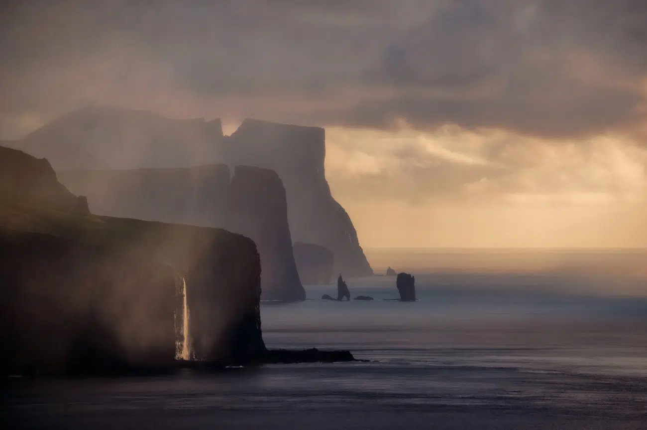 “For just a brief moment, the sun broke through the dark clouds and illuminated a waterfall on the Faroe Islands.”
