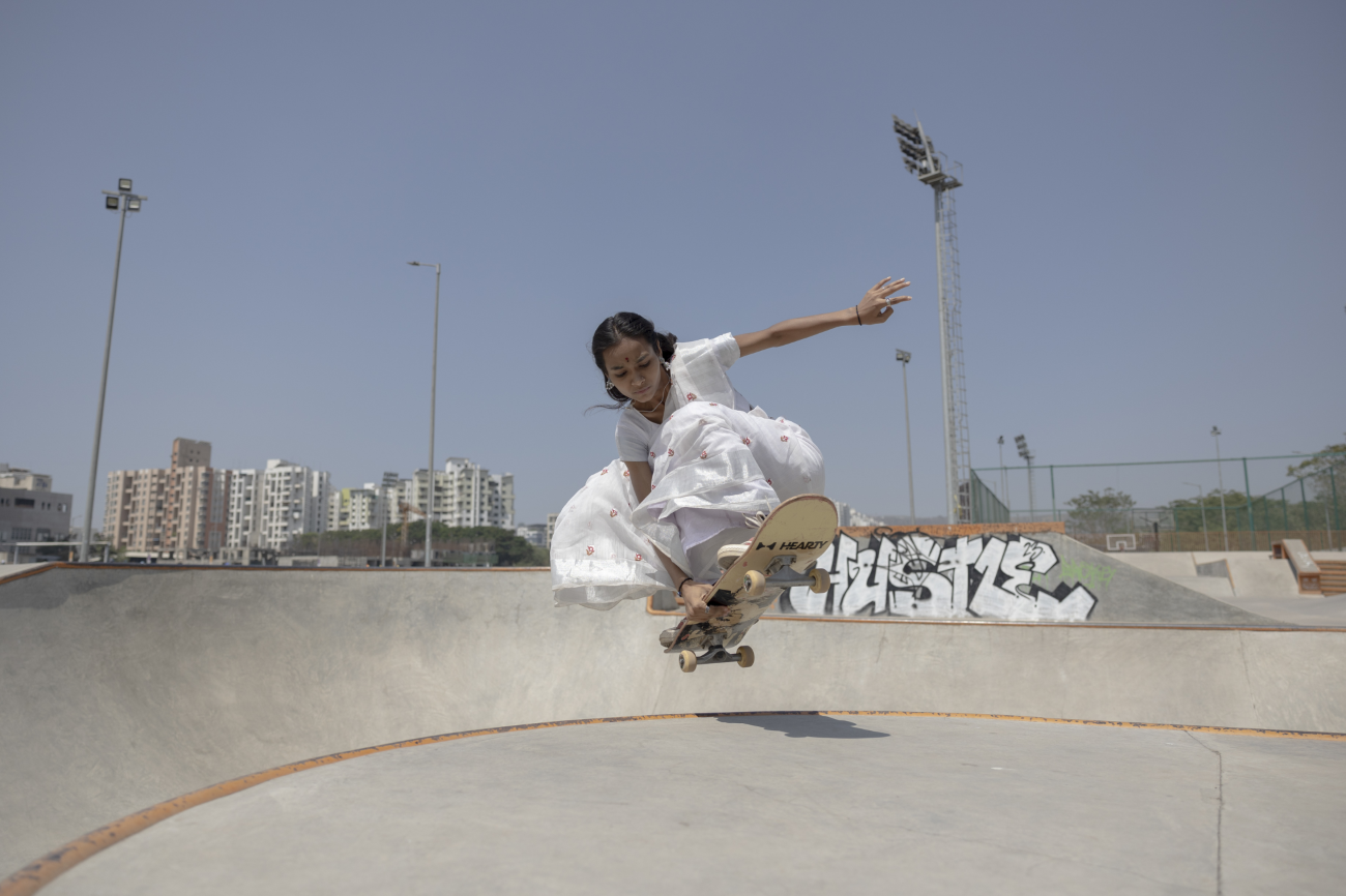 “Shradda Gaikwad (18) is originally from Beed, a less developed area in Maharashtra, but now resides in Pune. She stumbled upon skateboarding while delivering lunch to her father, who worked as a security guard at a sports store. She is now a national champion. Here, Shradda is performing a ‘fly out indy grab’ from the bowl at Pune's park, dressed in a white saree.