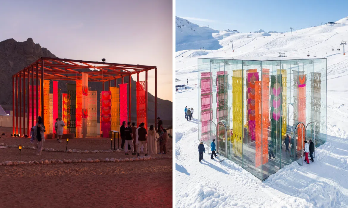 Last November, hundreds of visitors descended upon the Mleiha desert for the 2025 Tanweer Festival. There, amid the rolling dunes and golden sand, Milla Novo unveiled Ancestral Whispers, a large-scale installation composed of vibrant, natural fiber panels that gently swayed in the desert breeze. The work’s vibrancy perfectly complemented its surroundings; but, during a recent ski trip, the Dutch-Chilean artist wondered whether Ancestral Whispers could transcend its original setting.
