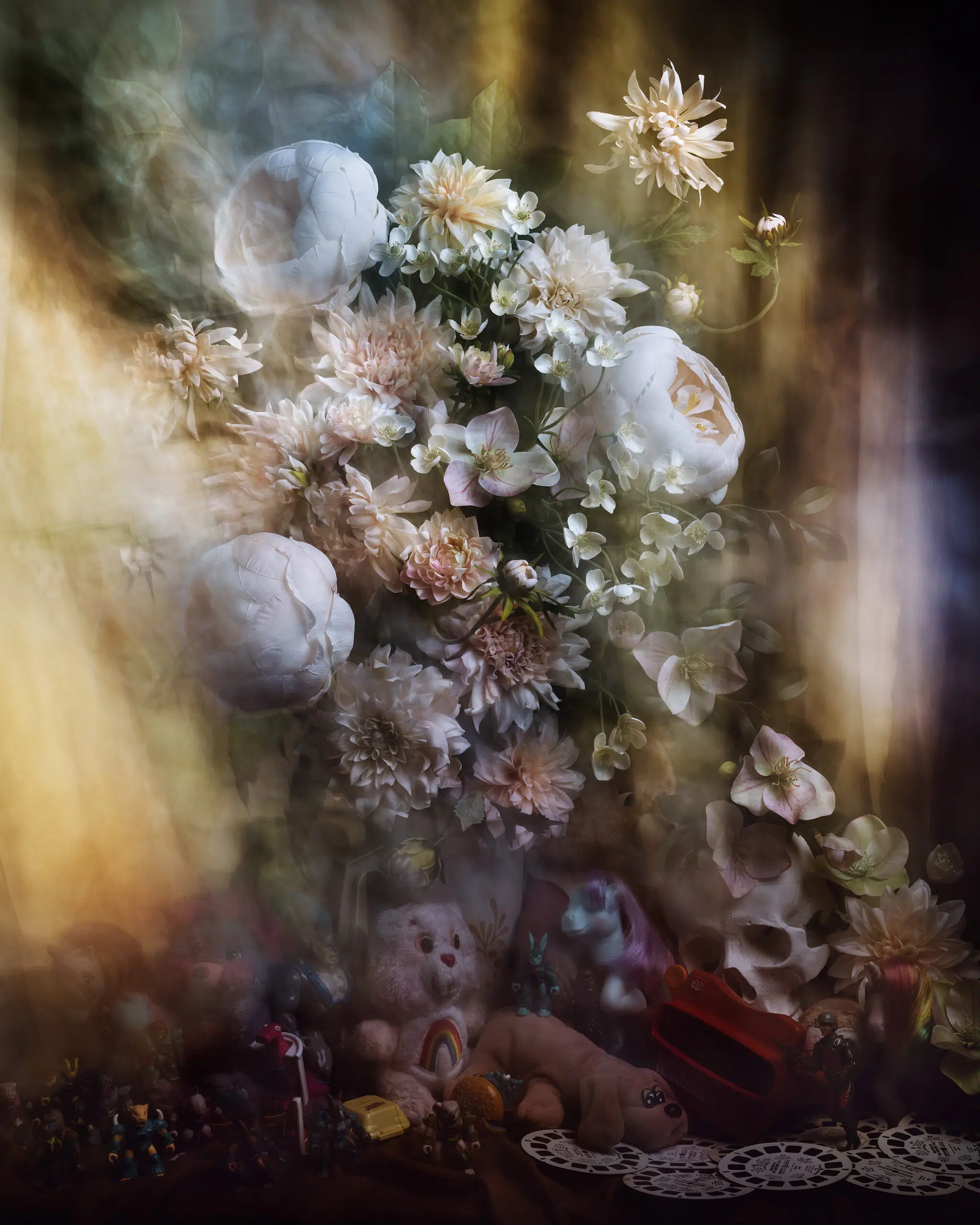 Leitz’s colorful and disorienting works present vanitas, a type of still-life painting popularized by 17th-century Dutch painters emphasizing the transiency of life and the certainty of death. Vanitas are a potent reminder that the only constant is that things change. While they might typically be symbolized with a skull or hourglass, Leitz’s scenes have a contemporary spin. Beneath bountiful bouquets are icons of childhood nostalgia for those who grew up in the 1980s: Care Bear dolls, Barbies, an Easy-Bake Oven, and various action figures and toy cars. Meticulously arranged and paired with a long camera exposure, the resulting images don’t sit still; they, instead, have a ghostly feel.