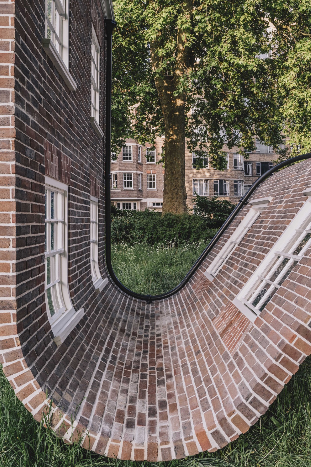 In reality, the structure is anchored by a solid core of repurposed steel that came from the demolition of the former American Embassy in London. Thanks to bespoke bending windows, 7,000 bricks, a door, stone details, and a drainpipe, the freestanding sculpture takes on a realistic appearance. Shockingly, given that it weighs 12.6 tons, the piece also appears light and airy thanks to the facade's 6-inch depth.