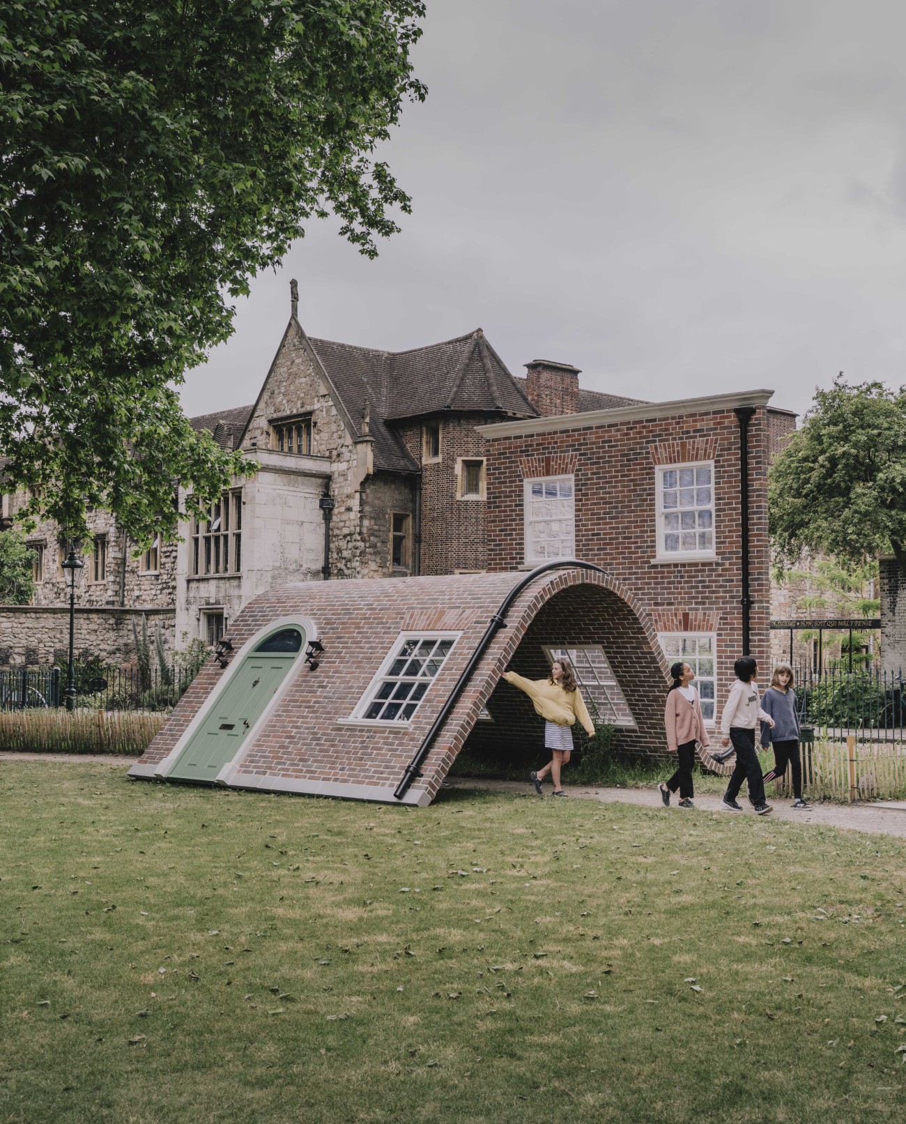 Located in London's Charterhouse Square, the installation mirrors the architectural details of the Georgian houses that surround it, with a surreal twist. Chinneck's attention to detail, from the brickwork to the windows and lighting fixtures bring the illusion to life, as the piece appears to be a home that is sliding down and taking a seat on the ground.
