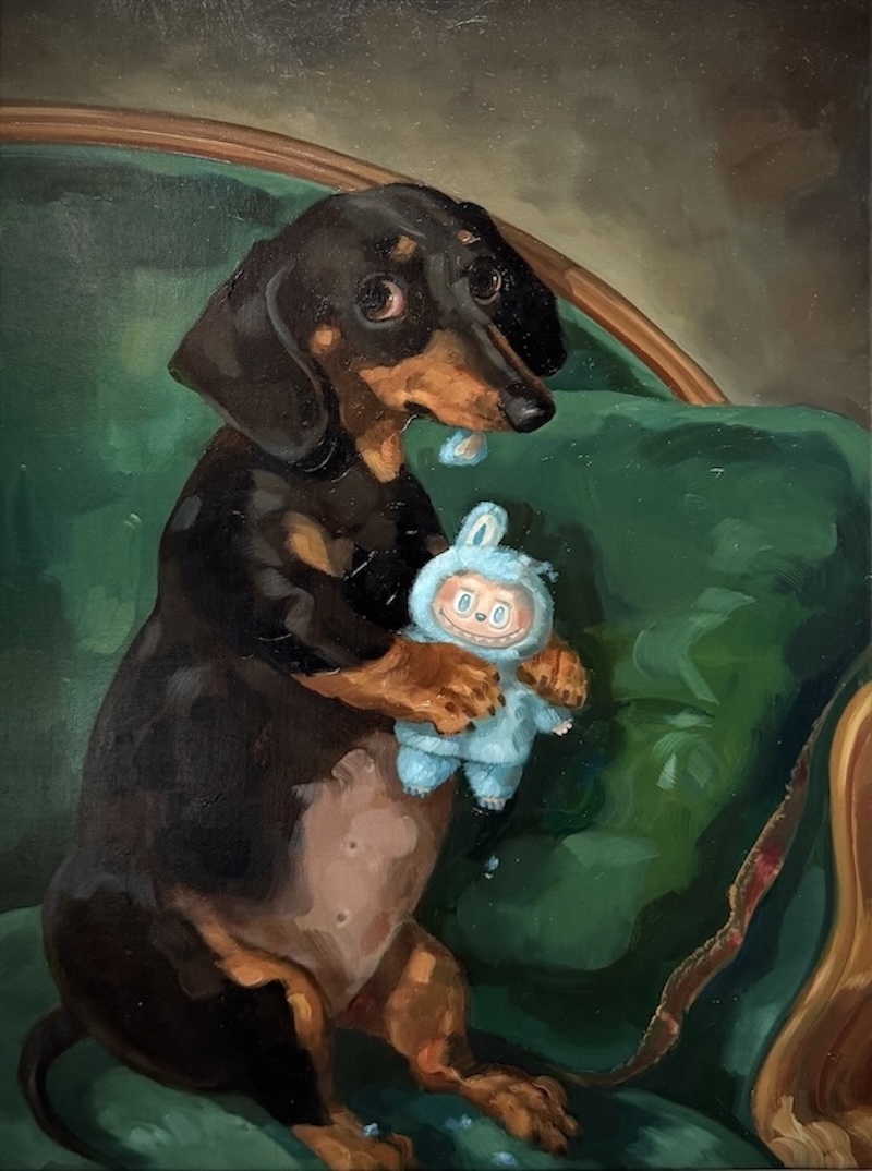 From the subjects’ expressions to their random array of objects, Friend sets the scene in each painting to feel a range of pleasant emotions—be it joy, whimsy, or even nostalgia. In a piece titled U Ok Bun?, for instance, Friend evokes a tender sense of empathy and a gentleness that’s reminiscent of childhood as two doe-eyed bunnies share a tender moment reading a book together. Meanwhile, another painting titled The Agony and the Ecstasy relies on visual irony and situational humor. In this artwork, the subject is a dog with an outstretched tongue that falls just short of licking the ice cream cone in his paws because he’s wearing a cone himself.