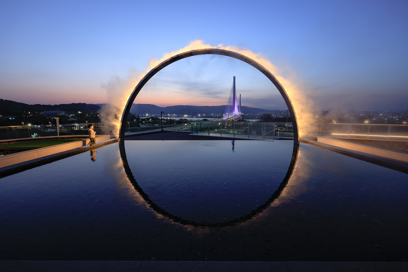 Perched along the Han River in Seoul, South Korea, is an installation that almost seems supernatural: it breathes mist, its surface is blank and doesn’t reveal anyone’s reflection, and it shimmers quietly in the setting sun. The project in question is James Tapscott’s Arc ZERO: Eclipse, the artist’s latest addition to his Arc ZERO series.
