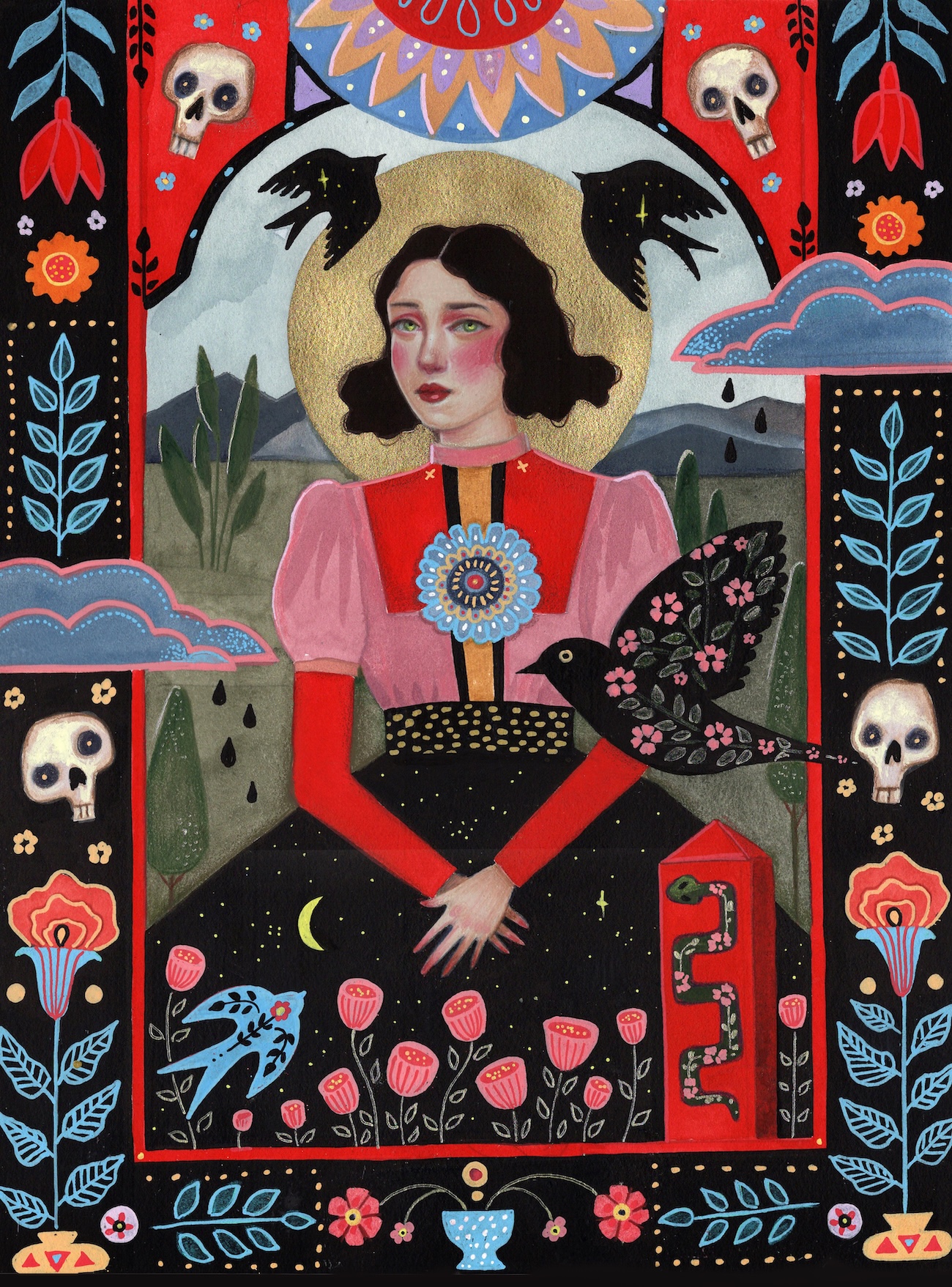 Starting over inspired Kahn to return to her roots in Michigan and Canada, and to the German and Polish folk art from her grandparents’ home. “Everything clicked,” she says. “Themes of sanctuary, life and death, and transformation have always run through my life and finally had a visual language to match. Placing the human figure at the center felt completely natural. People are how I tell that story.”