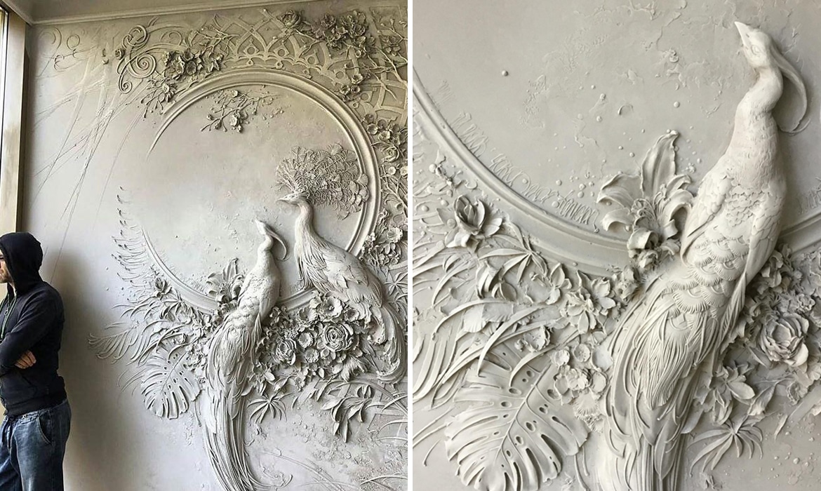 Russian creative Goga Tandashvili adds an artistic touch to otherwise ordinary walls with his intricate bas-relief sculpture work. Using a combination of hand building and carving tools, the Russian sculptor brings nature-inspired scenes to life as they integrate seamlessly with their surroundings. Giant peacocks, bunches of blooms, and decorative flourishes rise from a flattened surface, resulting in large pieces that are part home decor and part stunning work of art.