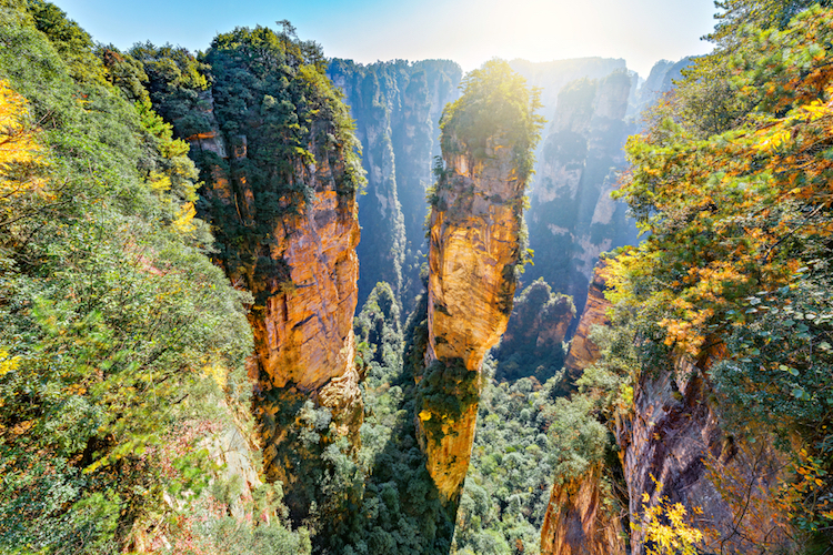 The Zhangjiajie National Forest Park is China's first national park and is known for its vertical stone pillars.