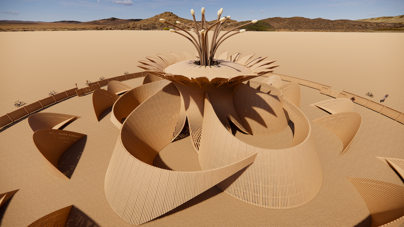 Gwertzman organizes the Temple of the Moon through a radial plan inspired by lunar cycles. He also draws from the Queen of the Night, a rare cactus flower that blooms for a single night, using its brief life cycle to inform both the structure’s form and its emphasis on impermanence. Parametric modeling shapes the temple’s curved geometry, with straight timbers to be assembled into sweeping arcs that resemble an unfolding flower.