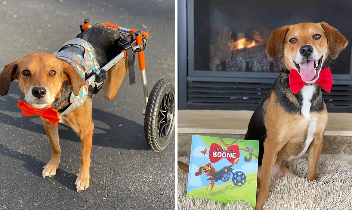 Meet Boone, an adorable Beagle with an inspiring story (and an impressive collection of bow ties). Before this lovable pooch was adopted by an adoring family, Boone sadly suffered through a life of abuse. His previous owners intentionally cut his back legs off, leaving him unable to walk. It’s difficult to comprehend how anyone could be so cruel; but luckily, Boone was rescued by people who have his best interests at heart.